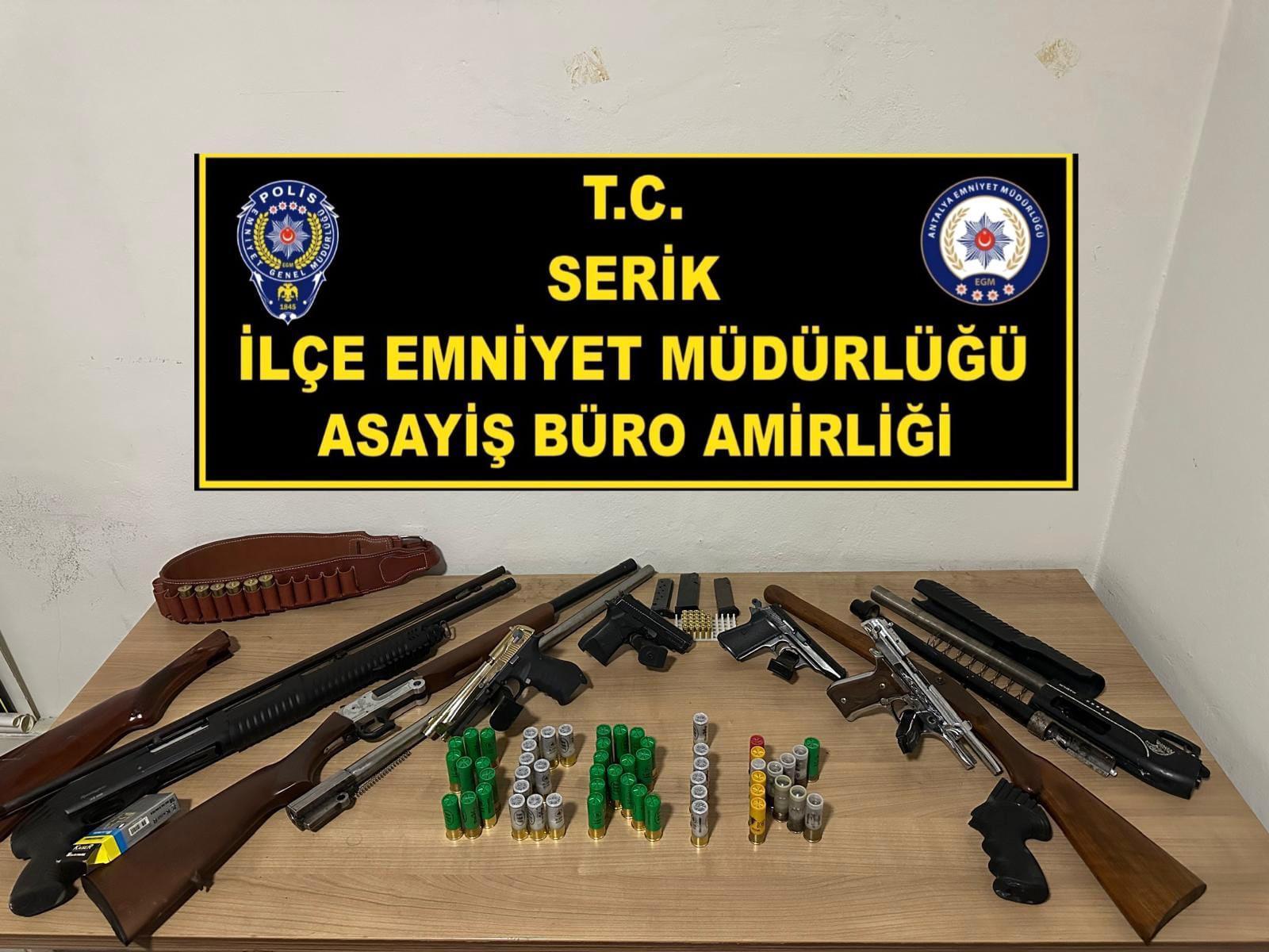Serik Cumhuriyet Başsavcısı talimatıyla İlçe Emniyet Müdürlüğü'ne bağlı 22 ekip ve 77 personel sabah saatlerinde 11 şüpheliye ait 12 adrese eş zamanlı operasyon yaptı. Suça karışan, silah ve uyuşturucu bulundurabileceği değerlendirilen şüphelilerin adreslerinde yapılan aramada 2 ruhsatsız pompalı tüfek, 2 ruhsatsız av tüfeği, 4 ruhsatsız tabanca, 55 fişek ve 83 dolu kartuş ve 3 boş şarjör ele geçirildi. Operasyonda 8 şüpheli yakalandı, 3 şüphelinin yakalanmasına yönelik çalışmalar devam ediyor. (DHA)