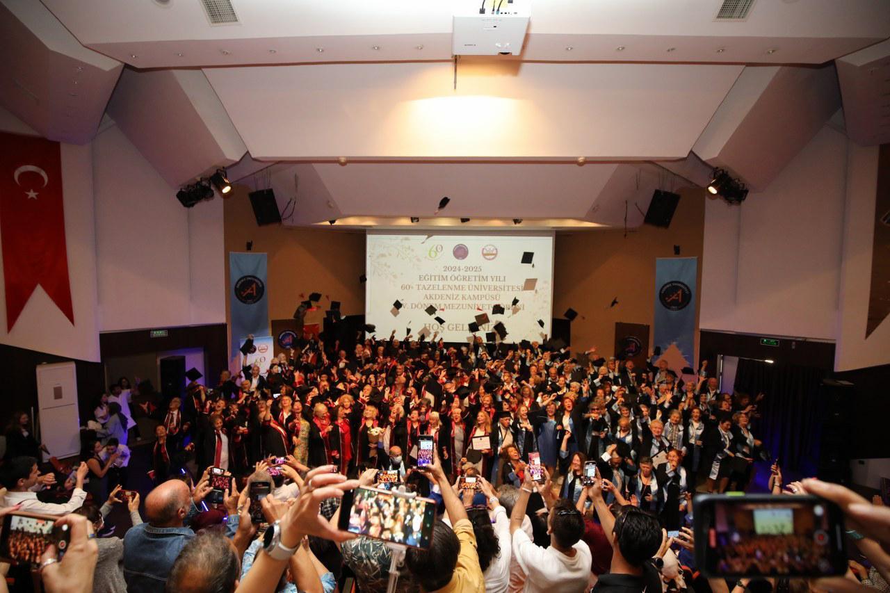 ANTALYA, (DHA)- TÜRKİYE’nin öncü sosyal sorumluluk projesi, Akdeniz Üniversitesi 60+ Tazelenme Üniversitesi'nin 107 lisans öğrencisi mezun olurken, bu yıl ilk kez 101 yüksek lisans öğrencisi de mezuniyet sevinci yaşadı. Törende Rektör Özkan, okuldan ayrılmak istemeyen öğrencilere doktora programının sözünü verdi.