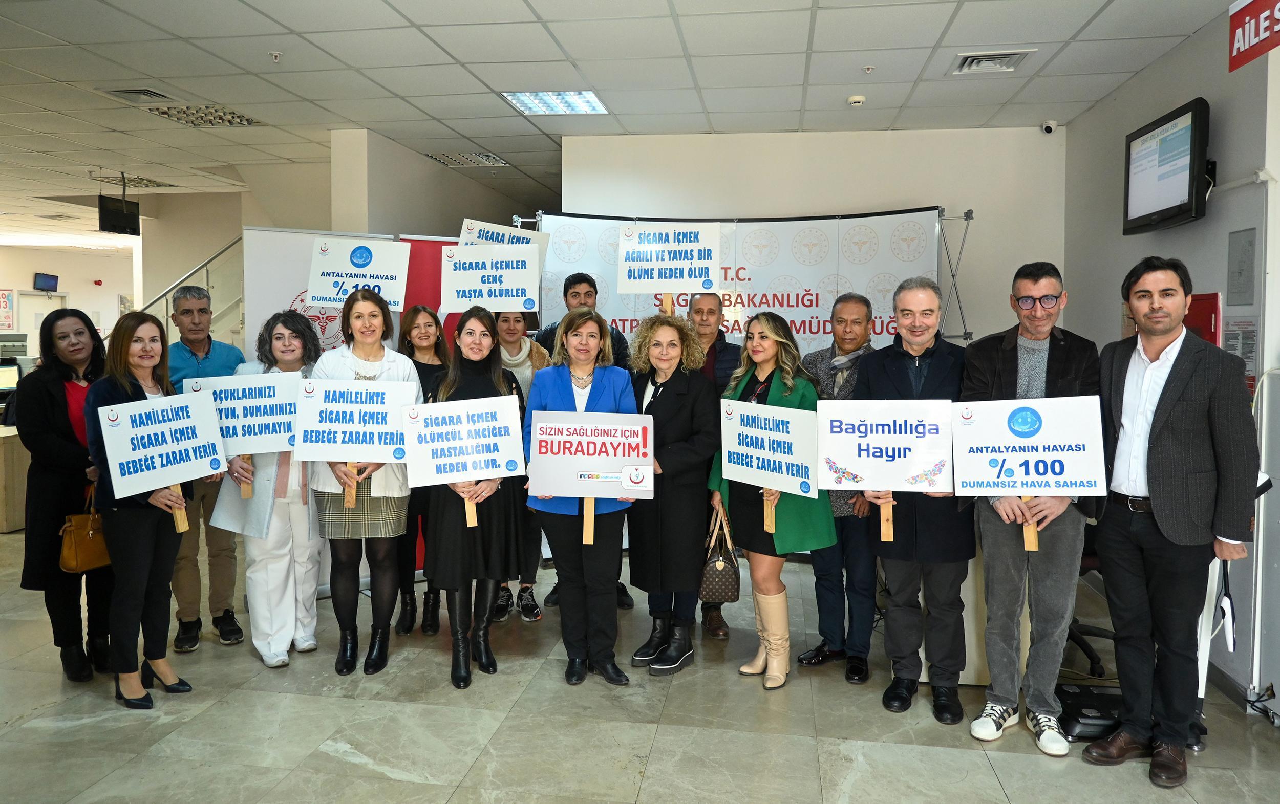 ANTALYA, (DHA)- ANTALYA İl Sağlık Müdürlüğü Tütün ve Bağımlılık Yapıcı Maddelerle Mücadele Birimi ile Muratpaşa İlçe Sağlık Müdürlüğü ve Şehit Atilla Nizam Sağlıklı Hayat Merkezi çalışanları tarafından 9 Şubat Dünya Sigara Bırakma Günü kapsamında vatandaşlara tütünün zararları hakkında bilgilendirme yapıldı.