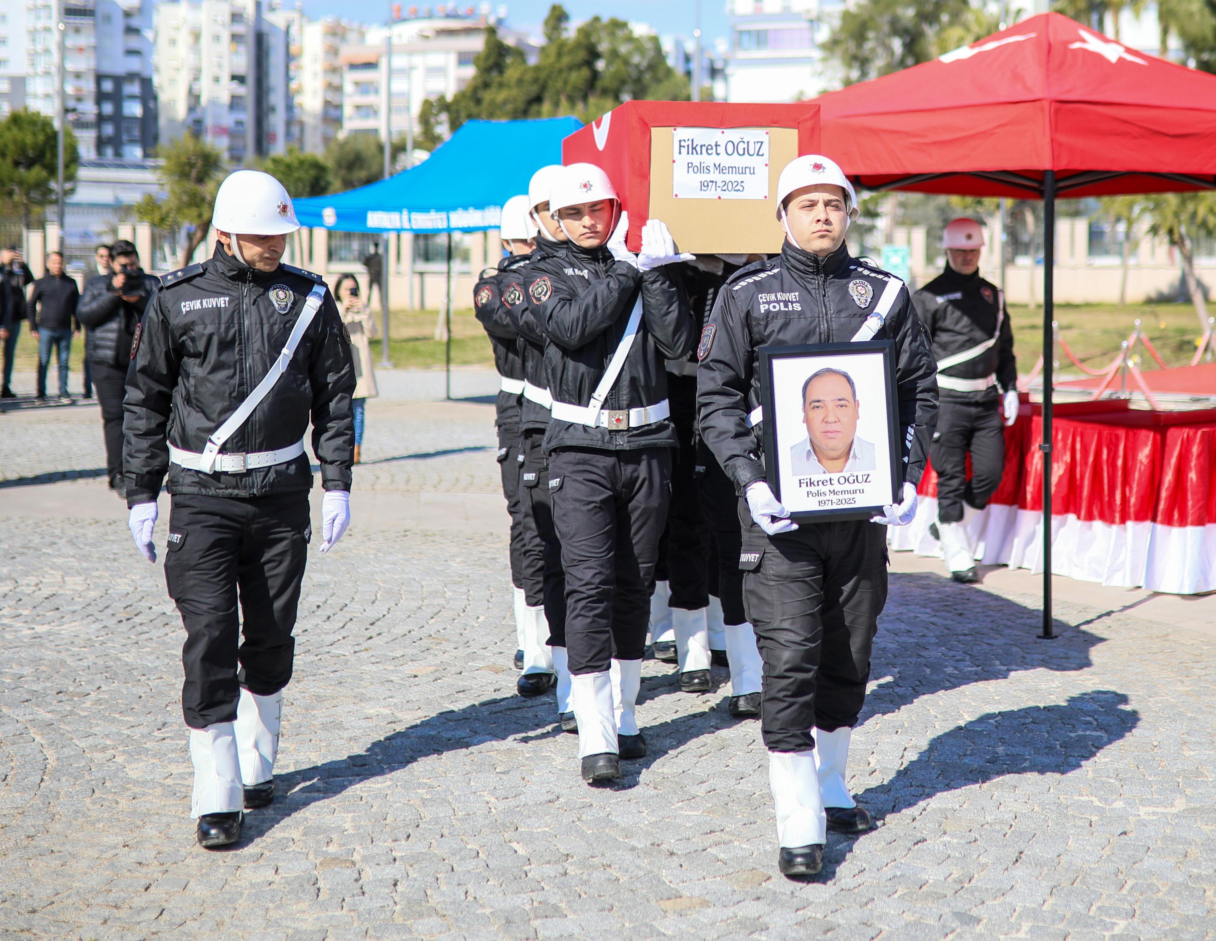 Semih ERSÖZLER/ANTALYA, (DHA) - ANTALYA'da dün evinde vefat eden polis memuru Fikret Oğuz (54) için İl Emniyet Müdürlüğü binasında cenaze töreni düzenlendi.