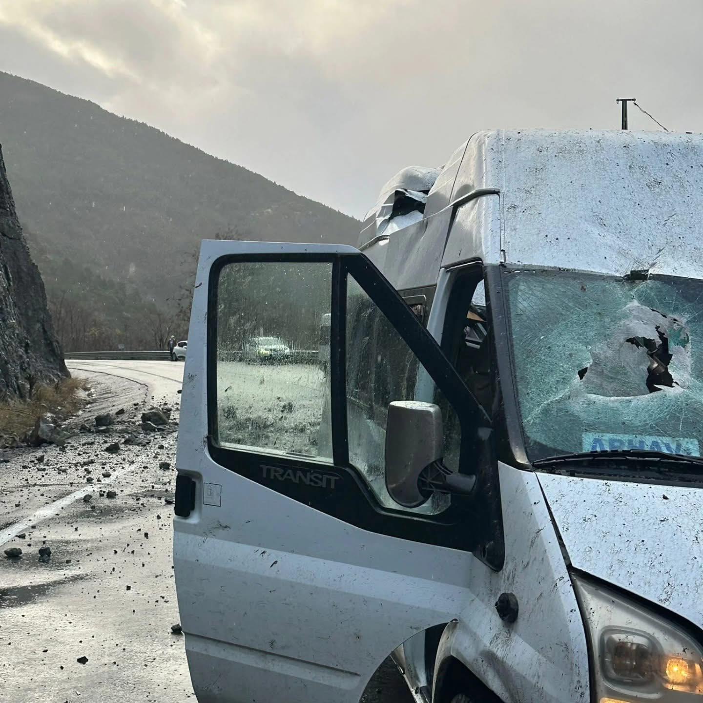 Olay, sabah saatlerinde Artvin-Borçka kara yolunun İbrikli mevkisinde meydana geldi. Yamaçtan kopan kaya düştüğü yolda ilerleyen sürücüsünün ismi ve plakası bilinmeyen minibüse isabet etti. Kaya, ön koltuklarında 3 kişinin bulunduğu minibüsün tavanını parçalayarak yolcu koltuğu üzerine düştü. Araçta arka koltuklarda yolcu olmaması olası can kaybı ve yaralanmamın önüne geçti. Bir süre ulaşama kapanan yolda, ekipler önlem alarak iş makineleriyle temizlik çalışması başlattı. Çalışmaların tamamlanmasının ardından yol yeniden kontrollü olarak ulaşıma açıldı. (DHA)