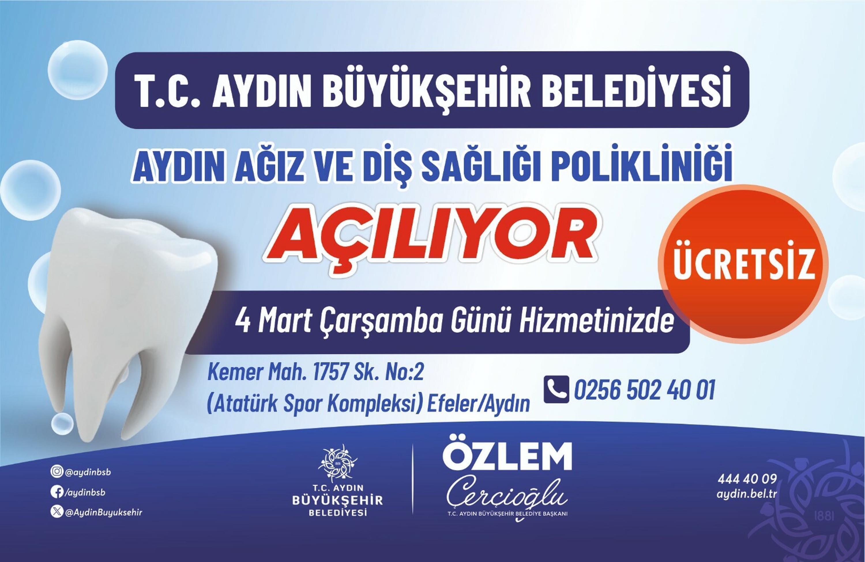 AYDIN,(DHA)-AYDIN Büyükşehir Belediyesi tarafından hayata geçirilen ve ücretsiz olarak hizmet veren Aydın Ağız ve Diş Sağlığı Polikliniği'nin 4 Mart tarihinden itibaren hizmet vereceği duyuruldu.
