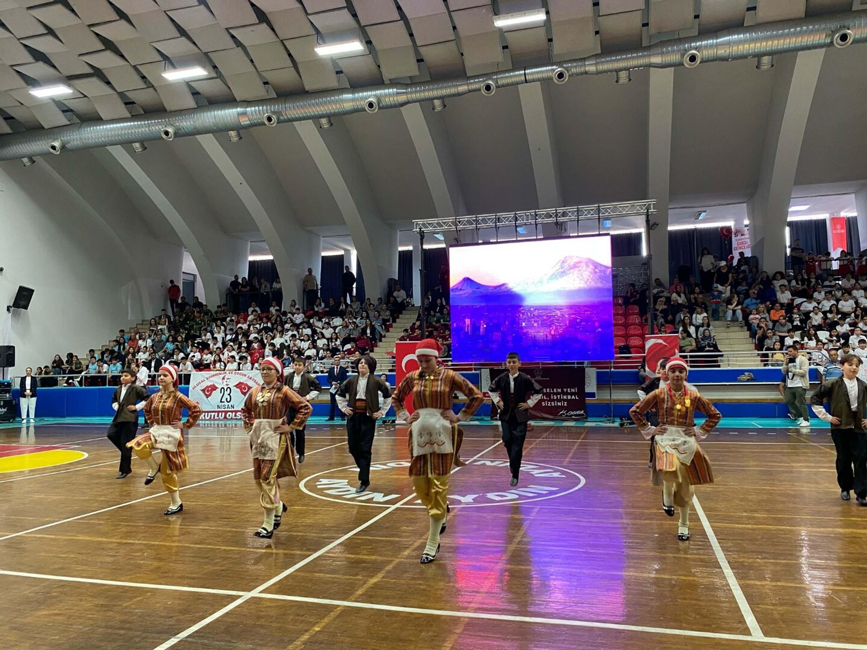 Öğrenciler daha sonra valilik önünden Türk bayrağı ile kortej yürüyüşü yaparak Atatürk Spor Salonu'na yürüdü. Atatürk Spor Salonu'nda yapılan tören saygı duruşu ve İstiklal Marşı'nın okunmasının ardından öğrencilerin şiir okuması gerçekleşti. İl Milli Eğitim Süleyman Ekici'nin günün anlam ve önemini taşıyan konuşmasının ardından yedi bölge halk oyunları gösterileri sunuldu.