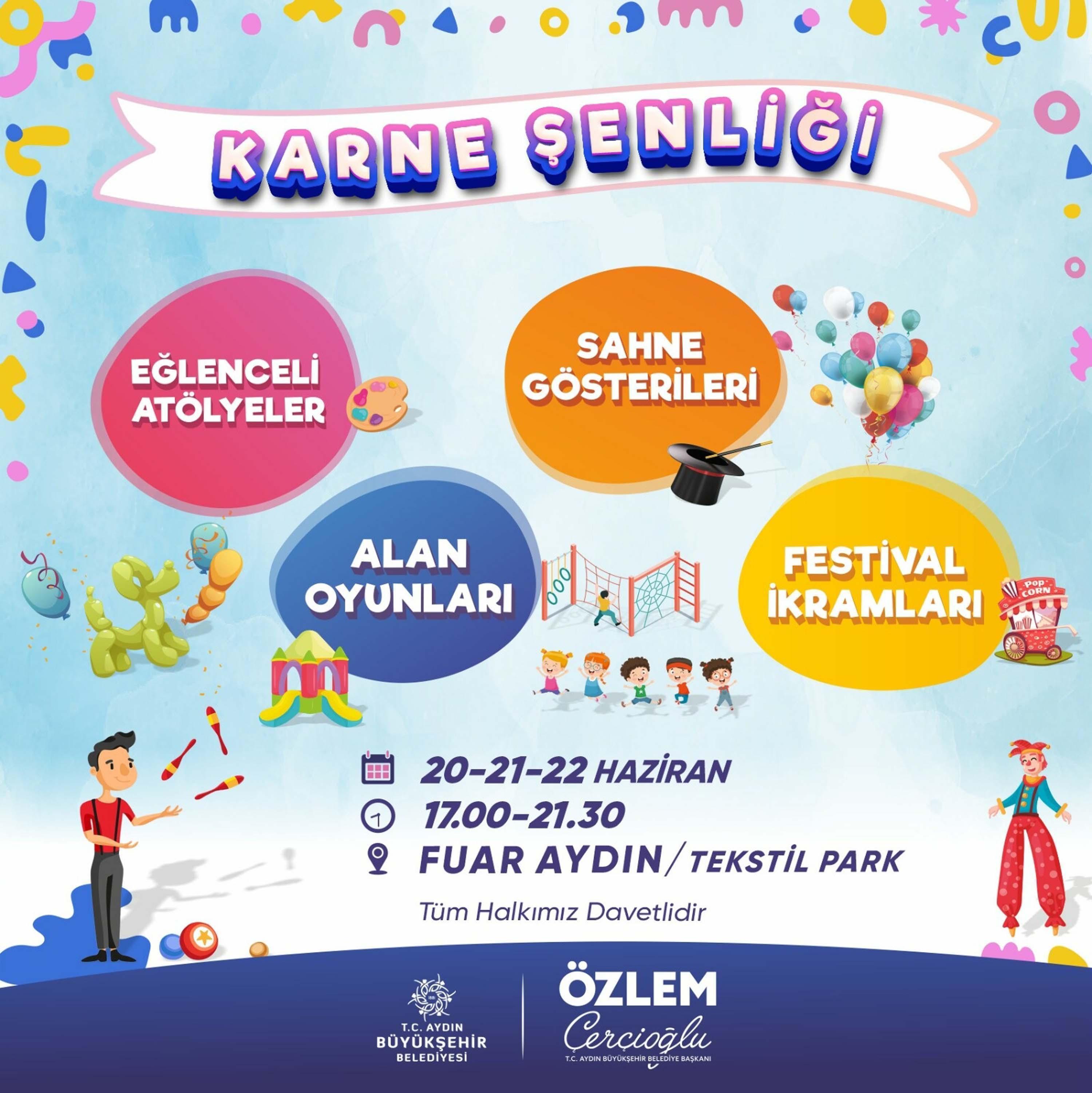 AYDIN, (DHA)-AYDIN Büyükşehir Belediyesi, 2024-2025 eğitim öğretim yılının sona ermesiyle birlikte çocuklar için Karne Şenliği düzenleyecek. Tekstil Park'ta yapılacak etkinlikler 20-22 Haziran tarihleri arasında gerçekleştirilecek.