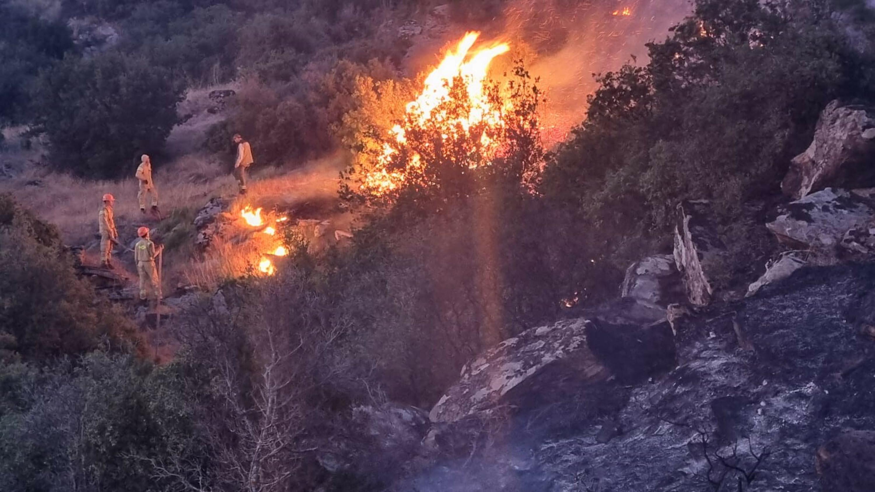 Aydın'ın Bozdoğan ilçesinde Yazıkent Mahallesi Kızılçakır mevkisindeki makilikte saat 16.00 sıralarında çıkan yangını söndürme çalışmaları devam ediyor. Ekipler, gece olduğu için müdahaleye karadan devam ediyor. (DHA)