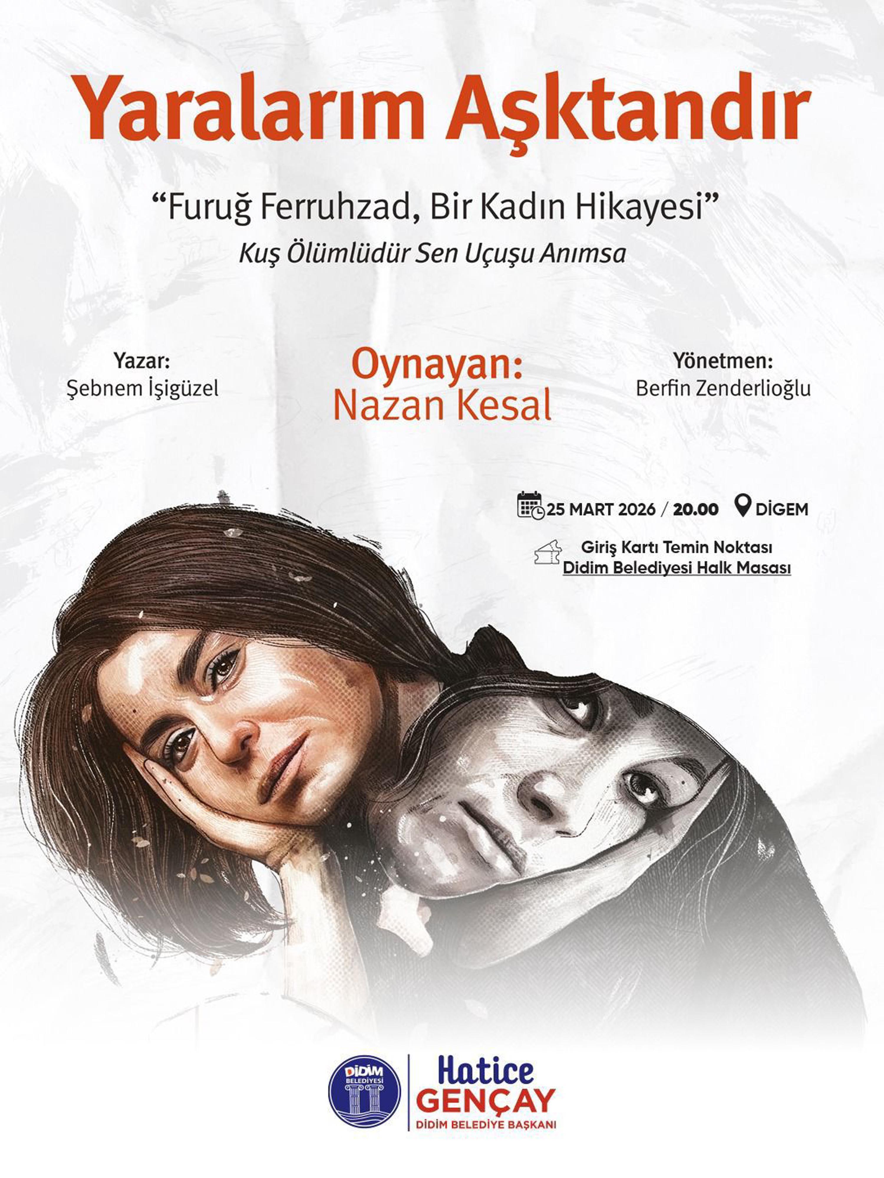 Didim Belediyesi, usta oyuncu Nazan Kesal'ın sahne aldığı 'Yaralarım Aşktandır' adlı tiyatro oyunu, sanatseverlere buluşturacak. Şair ve yönetmen Furuğ Ferruhzad'ın yaşam öyküsünden ilham alan oyun 25 Mart'ta saat 20.00'da, Didim Gençlik Merkezi'nde (DİGEM) sahnelenecek. Güçlü anlatımı ve derinlikli kurgusuyla dikkat çektiği belirtilen oyunun sınırlı kontenjanla izleyiciyle buluşacağı bildirildi.