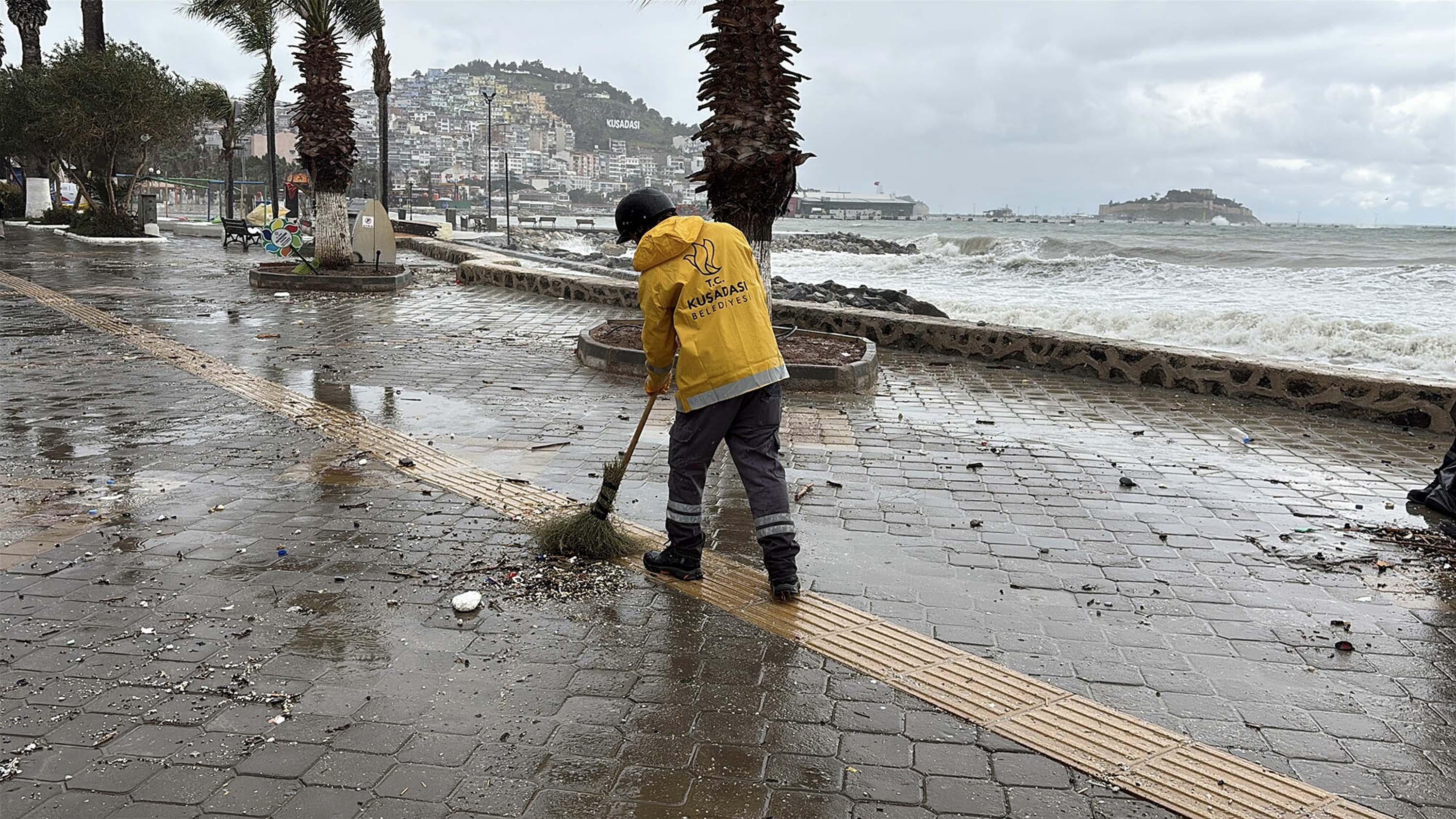 Kuşadası'nda sabah saatlerinden itibaren sağanak ve fırtına etkili oldu. Fırtına sebebiyle kabaran denizdeki dalgalar ve yağmur suları, sahil bandındaki kaldırımın üzerinin çamur, taş ile çöp benzeri atıklarla kaplanmasına neden oldu. Sabahın ilk ışıklarıyla birlikte yoğun bir mesaiye başlayan Kuşadası Belediyesi Temizlik İşleri Müdürlüğü ekipleri de vatandaşların mağduriyet yaşamaması için bölgede temizlik çalışması yürüttü. Bu kapsamda sahil bandı baştan sona biriken millerden arındırıldı. Fen İşleri Müdürlüğü, Temizlik İşleri Müdürlüğü, Park ve Bahçeler Müdürlüğü ile Acil Müdahale Birimi ekiplerinin zamanında koordineli bir şekilde yaptığı çalışmalar sayesinde, kent halkının yaşamının kısa sürede normale dönmesi sağlanıyor.(DHA)