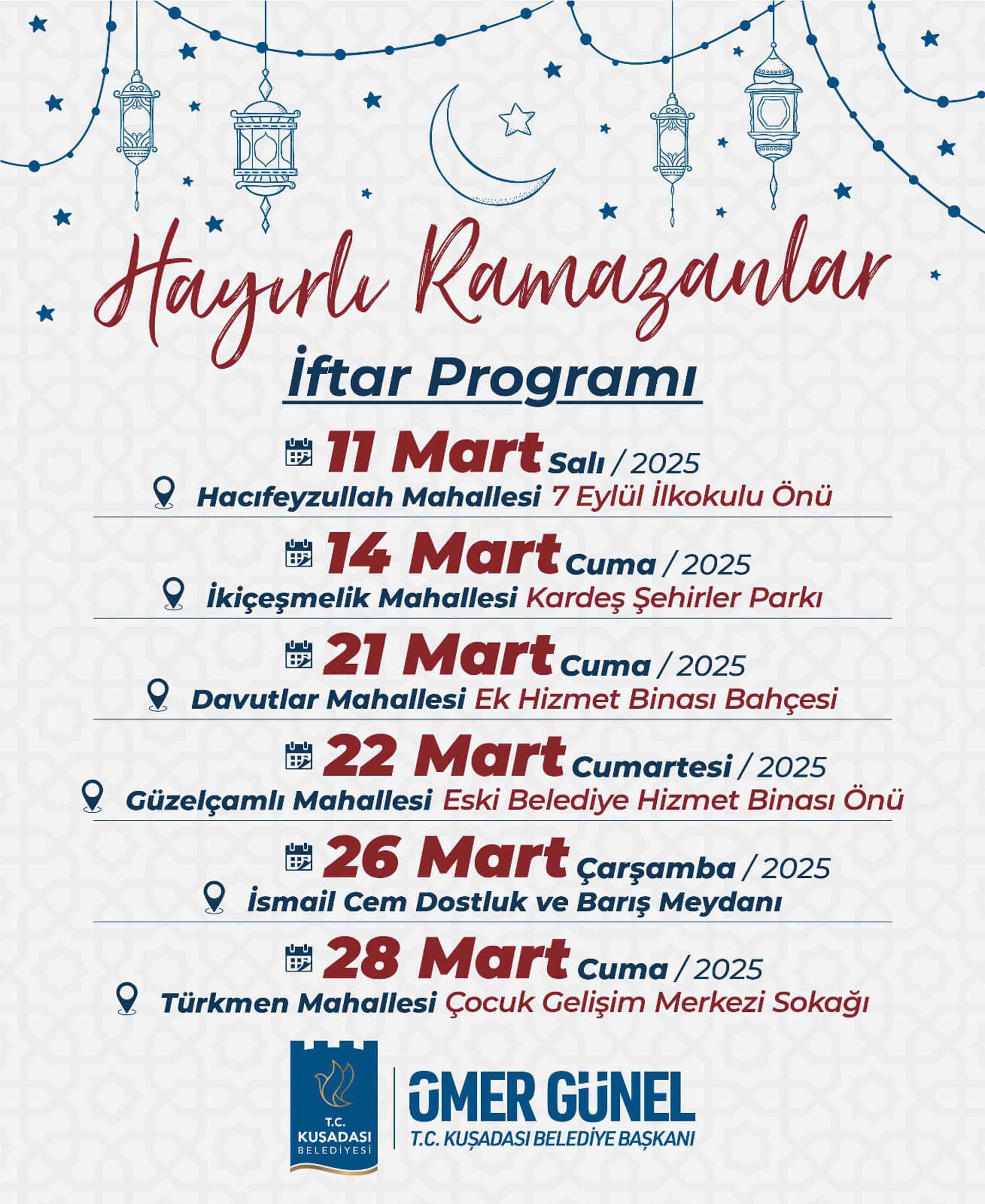 İftar programı, 14 Mart'ta İkiçeşmelik Mahallesi Kardeş Şehir Parkı, 21 Mart'ta Davutlar Mahallesi Ek Hizmet Binası bahçesi, 22 Mart'ta