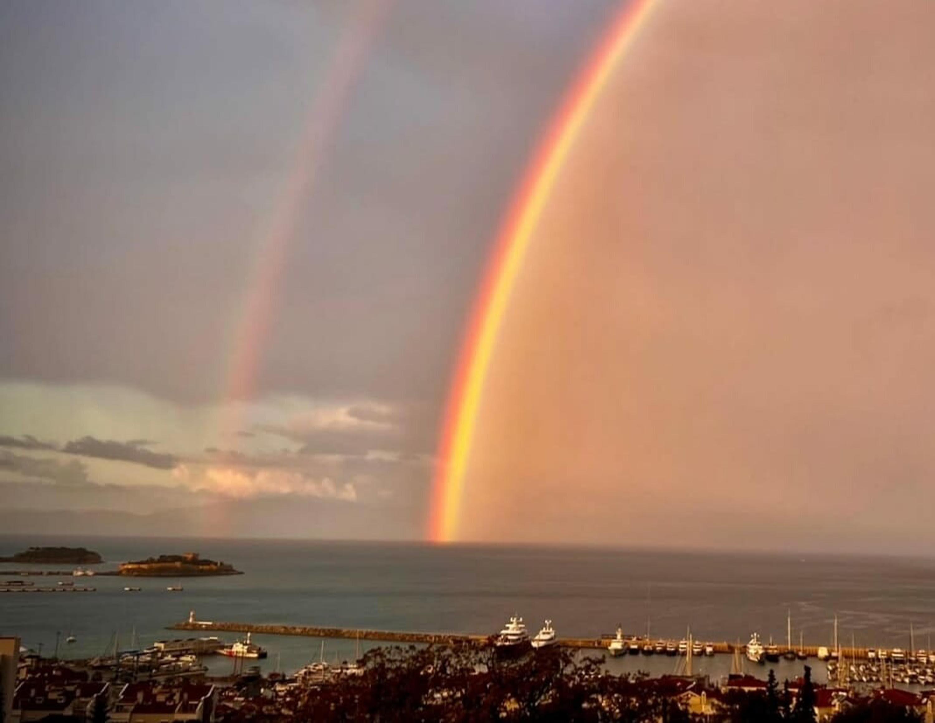 Oğuzhan BOYSAN / (KUŞADASI),(AYDIN),(DHA)-AYDIN’ın turistik ilçesi Kuşadası’nda yağmurun ardından güneşin açmasıyla birlikte deniz üzerinde gökkuşağı oluştu.