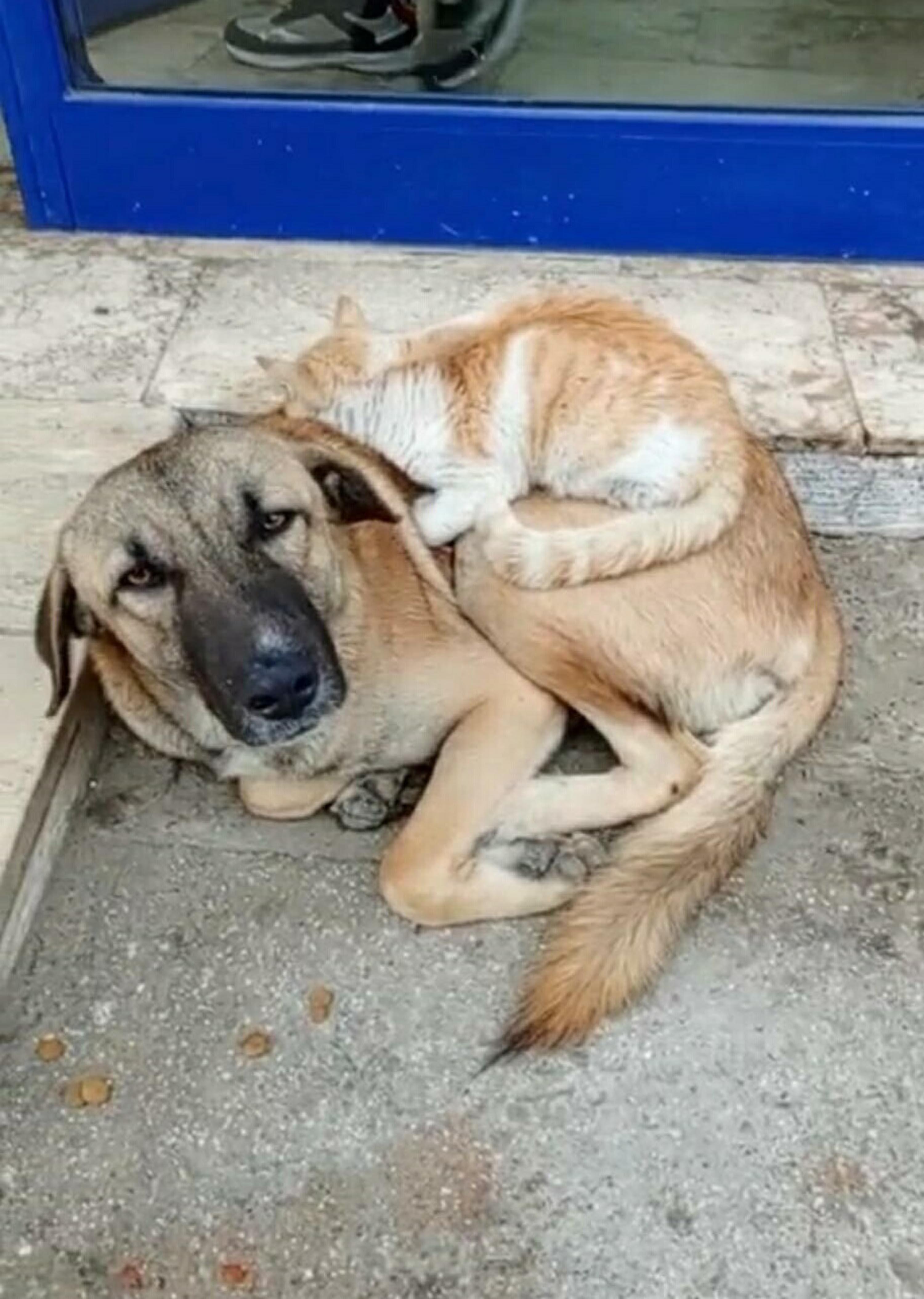 Nazilli Cumhuriyet Mahallesi’nde Hükümet Konağı giriş kapısı yakınında soğuk havada bir kedi ile köpeğin koyun koyuna yatması görenleri şaşırtıyor. Aynı kaptan mama yiyip, zaman zaman köpeğin sırtında uyuyan kedi dikkat çekiyor. İki hayvan arasındaki bağ, çevredekiler tarafından cep telefonu kamerasıyla görüntülendi. (DHA)