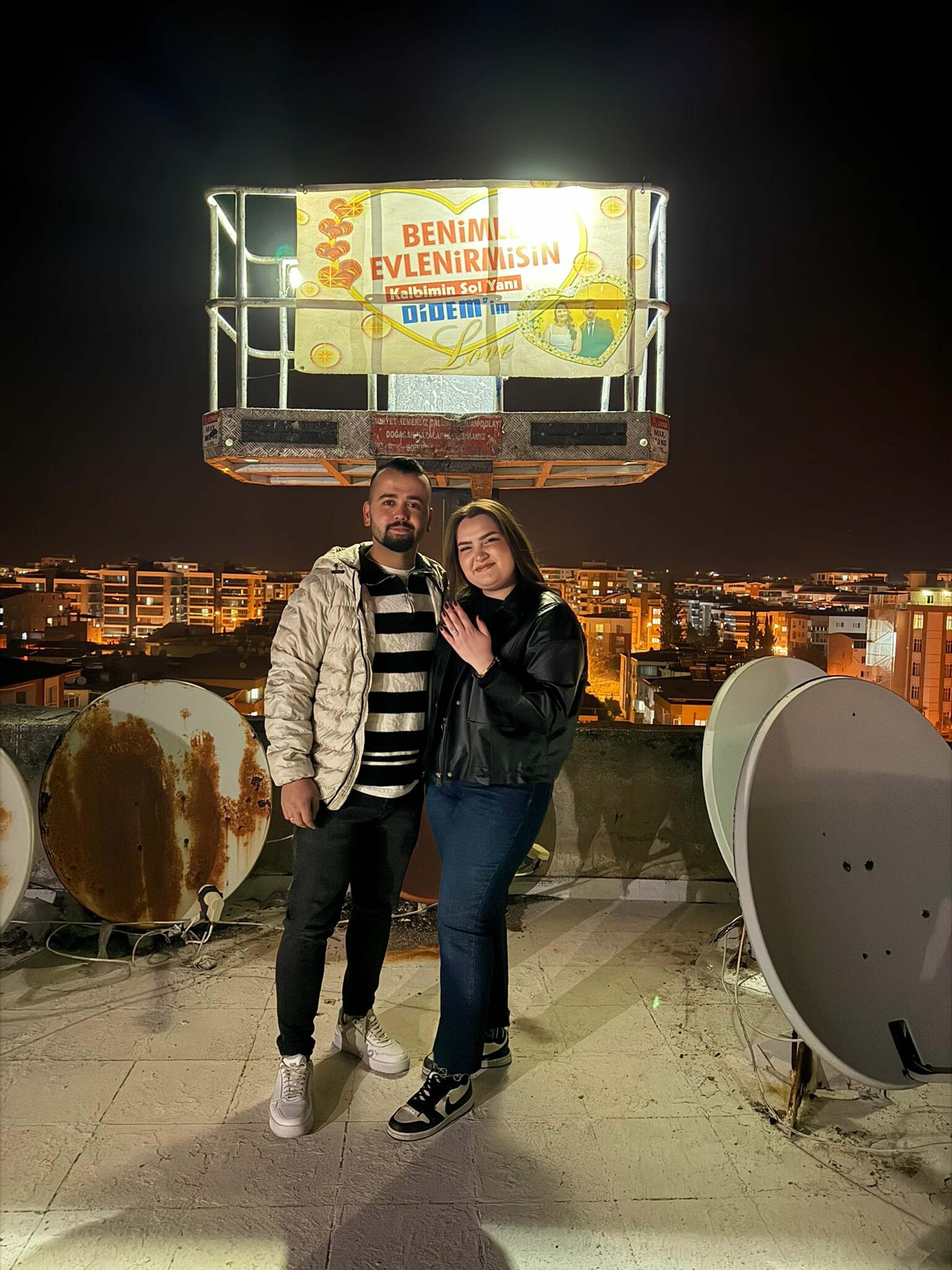 Nazilli’de sıhhi tesisat işiyle uğraşan Abdi Yangöz, kiraladığı vincin sepetine çıkarak apartmanın çatı katına yükseldi ve yıllardır planladığını belirttiği sürprizi gerçeğe dönüştürdü. Vinç sepetine asılan pankartta, “Benimle evlenir misin, kalbimin sol yanı Didem?” yazısı yer aldı. Romantik anlara Yangöz'ün arkadaşları da meşalelerle eşlik ederek görsel bir şölen sundu. Sürpriz evlilik teklifine gelin adayı Didem’den 'Evet' yanıtı geldi. Mutlu çift, teklifin kabul edilmesinin ardından vincin sepetiyle birlikte aşağıya indi.(DHA)