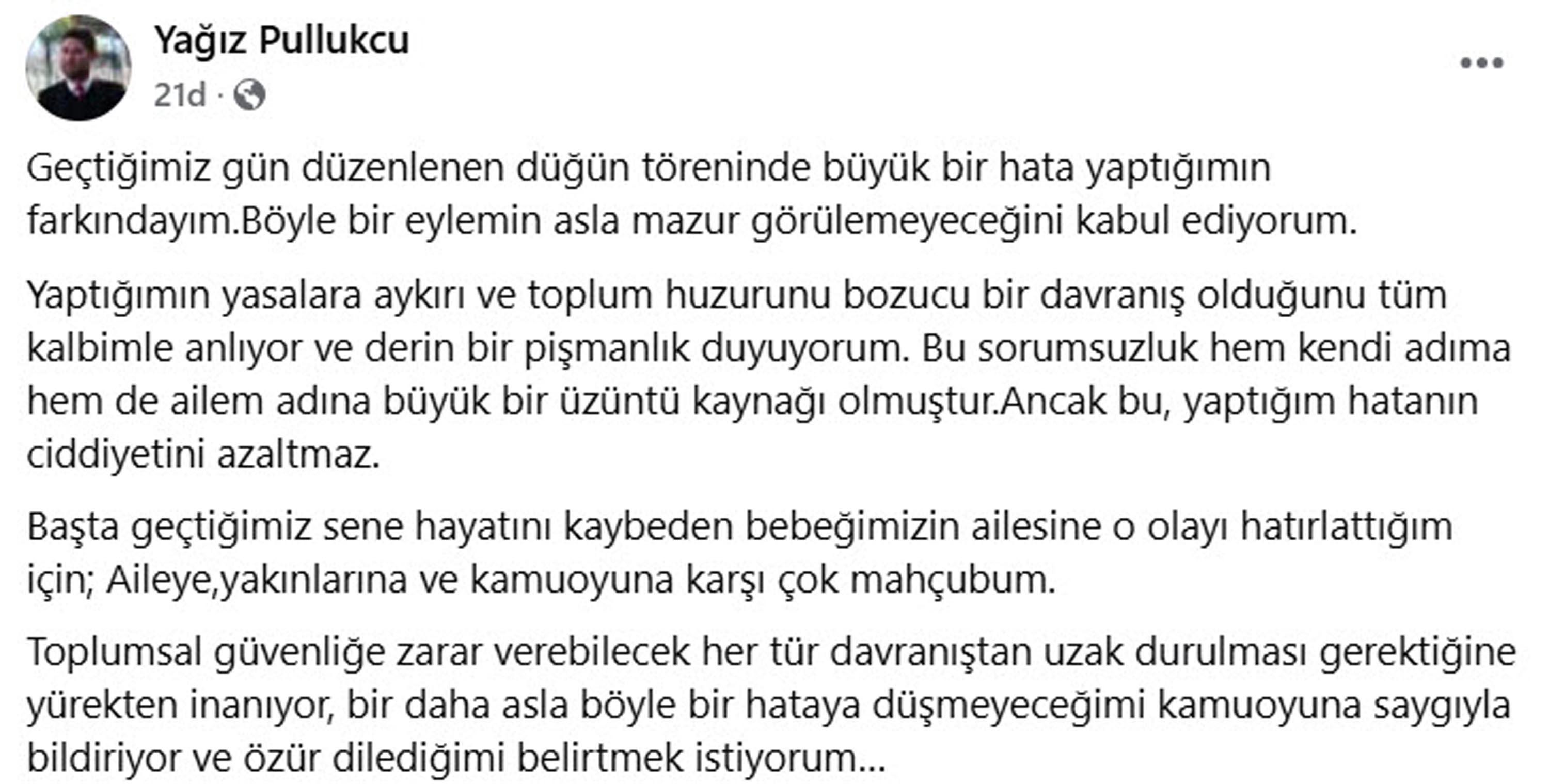 Aydın'ın Söke ilçesinde, bir düğünde havaya ateş açtığı belirlenip, gözaltına alınan ve sevk edildiği adliyede adli kontrol şartıyla serbest bırakılan Söke Belediye Başkan Yardımcısı Yağız Pullukçu, sosyal medya hesabından yaptığı paylaşımında, "Geçtiğimiz gün düzenlenen düğün töreninde büyük bir hata yaptığımın farkındayım. Böyle bir eylemin asla mazur görülemeyeceğini kabul ediyorum. Yaptığımın yasalara aykırı ve toplum huzurunu bozucu bir davranış olduğunu tüm kalbimle anlıyor ve derin bir pişmanlık duyuyorum. Bu sorumsuzluk hem kendi adıma hem de ailem adına büyük bir üzüntü kaynağı olmuştur. Ancak, bu yaptığım hatanın ciddiyetini azaltmaz. Başta geçtiğimiz sene hayatını kaybeden bebeğimizin ailesine o olayı hatırlattığım için, aileye, yakınlarına ve kamuoyuna karşı çok mahcubum. Toplumsal güvenliğe zarar verebilecek her tür davranıştan uzak durulması gerektiğine yürekten inanıyor, bir daha asla böyle bir hataya düşmeyeceğimi kamuoyuna saygıyla bildiriyor ve özür dilediğimi belirtmek istiyorum" dedi. (DHA)