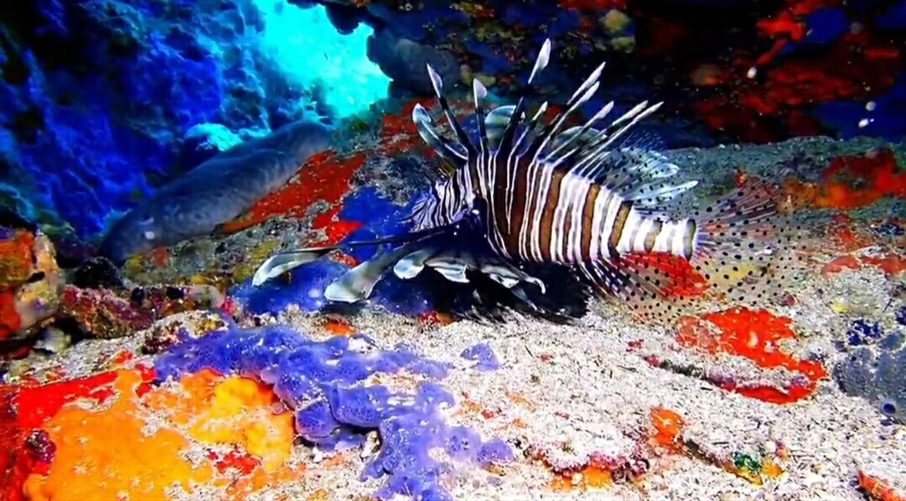 Kadri KAYA/AYVALIK (Balıkesir), (DHA)- BALIKESİR'in Ayvalık ilçesinde, su ürünleri mühendisi ve profesyonel dalgıç Nedim Kartal, 12 metre derinlikte dikenleri zehirli, istilacı bir tür olan aslan balığı görüntüledi.