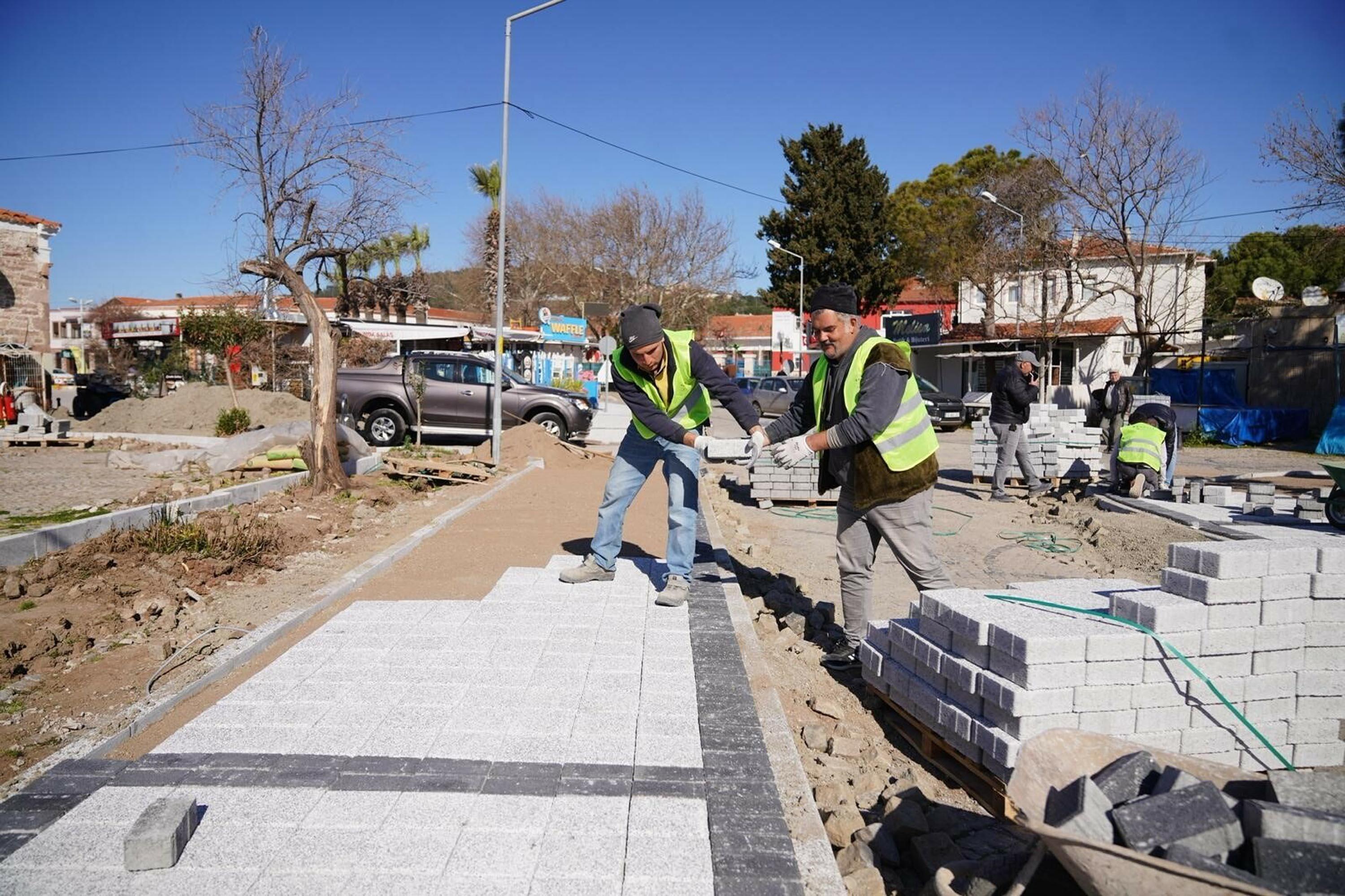 Ayvalık Belediyesi Fen İşleri Müdürlüğü, program dahilinde devam eden hizmetlerini aralıksız sürdürüyor. Bu kapsamda Alibey (Cunda) Adası'nda, Eski Yol Giriş Meydanı ile Ali Çetinkaya Meydanı arasında planlanan; kaldırım, çiçeklik, aydınlatma ve park düzenlemelerine yönelik çalışma yapılıyor. Ekipler, taş ve bordür döşemelerini gerçekleştiriyor.