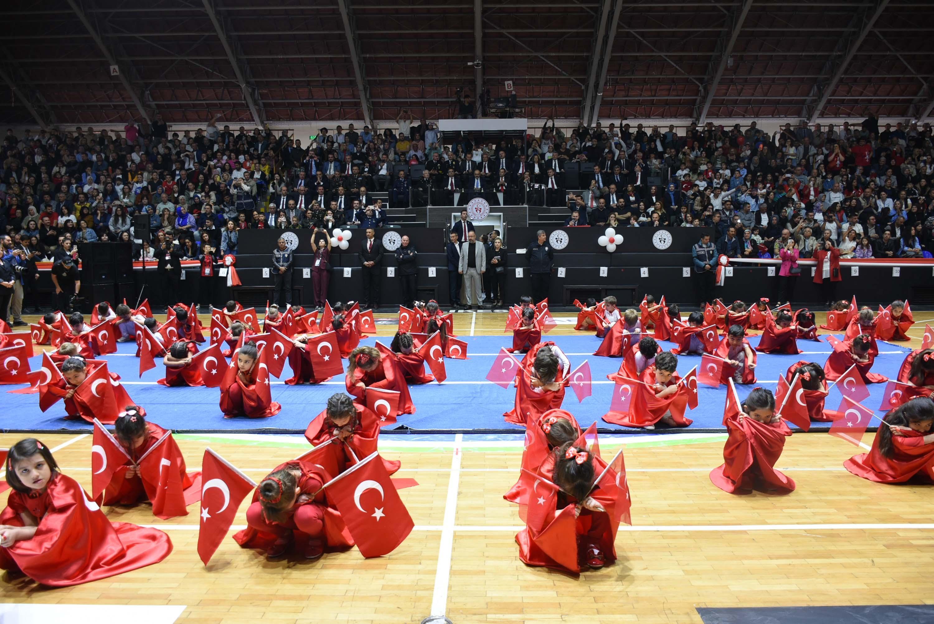 Türkiye Büyük Millet Meclisi'nin açılışının 105'inci yıl dönümü ve 23 Nisan Ulusal Egemenlik ve Çocuk Bayramı Balıkesir Kurtdereli Spor Salonu'nda düzenlenen coşkulu programla kutlandı. Spor salonu bahçesinde öğrenciler tarafından okulda hazırlanan maketler sergilendi. Spor salonundaki etkinlik saygı duruşu ve İstiklal Marşı'nın okunmasının ardından Milli Eğitim Bakanı Yusuf Tekin'in mesajının okunmasıyla başladı. Farklı bölgelerin halk oyunları gösterilerini sergileyen çocukların programı, mehter takımı gösterisiyle devam etti. Şarkı ve şiir sunumlarıyla süren programı protokol üyeleri ve veliler beğeniyle izledi. Programa Balıkesir Valisi İsmail Ustaoğlu ve Balıkesir Büyükşehir Belediye Başkanı Ahmet Akın da katıldı. (DHA)