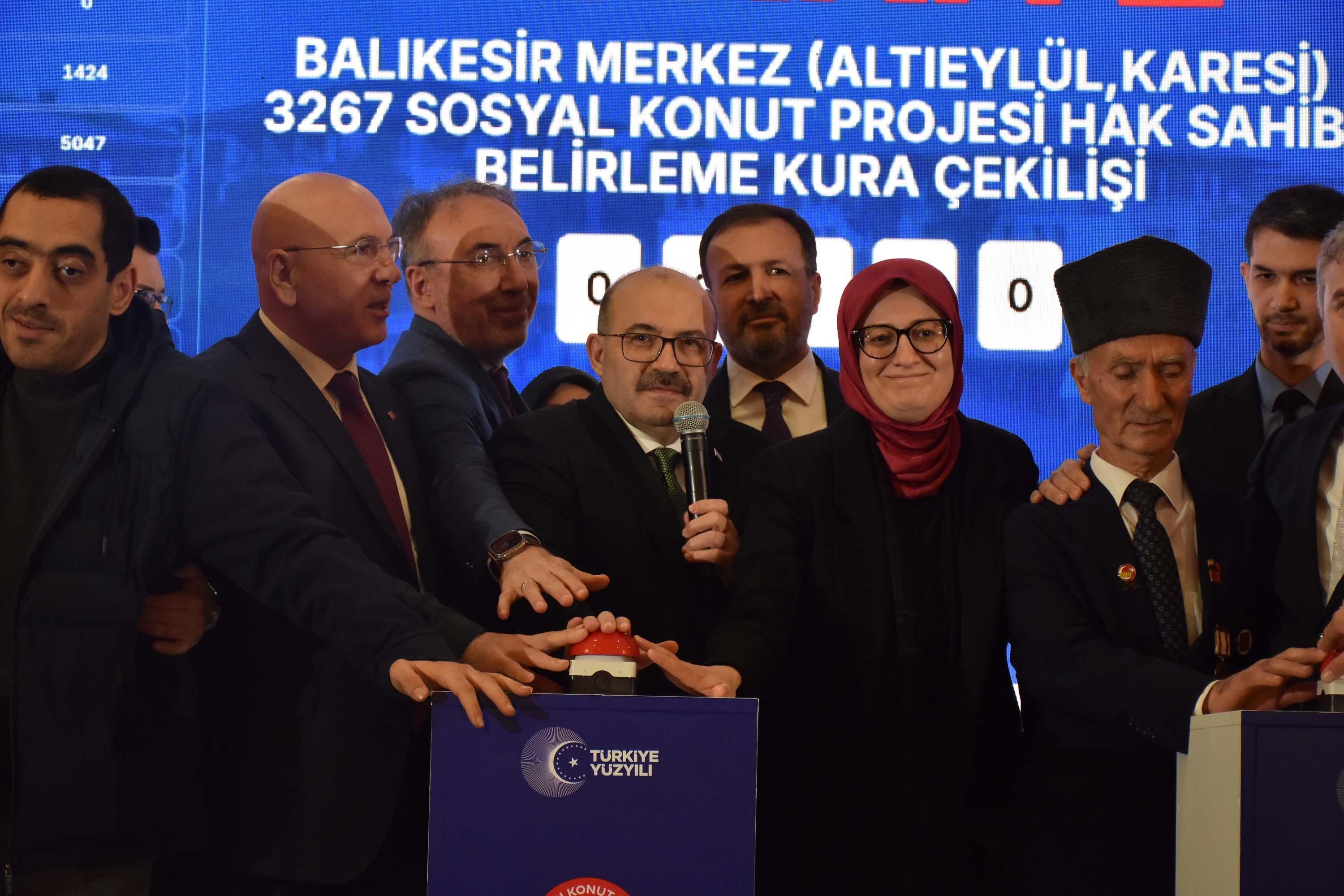 Cumhurbaşkanı Recep Tayyip Erdoğan'ın açıkladığı 81 ilde 500 bin sosyal konutun inşa edileceği Yüzyılın Konut Projesi kapsamında kura çekimleri sürüyor. Bu kapsamda kura çekimleri son olarak bugün, Balıkesir’de yapılan tören ile devam etti. Balıkesir Öğretmenevi’nde düzenlenen törene, Balıkesir Valisi İsmail Ustaoğlu, AK Parti Genel Başkan Yardımcısı, Balıkesir Milletvekili Belgin Uygur, AK Parti Balıkesir Milletvekilleri Mustafa Canbey, İsmail Ok, Çevre Şehircilik ve İklim Değişikliği Bakanlığı Çevre Yönetimi Genel Müdürü Fatih Turan, TOKİ Finansman Daire Başkanı Ayhan Karaca, AK Parti Balıkesir İl Başkanı Mehmet Aydemir, il protokolü ve çok sayıda vatandaş katılım sağladı.Saygı duruşu ve İstiklal Marşı’nın okunmasıyla başlayan tören, protokol konuşmaları ile devam etti.
