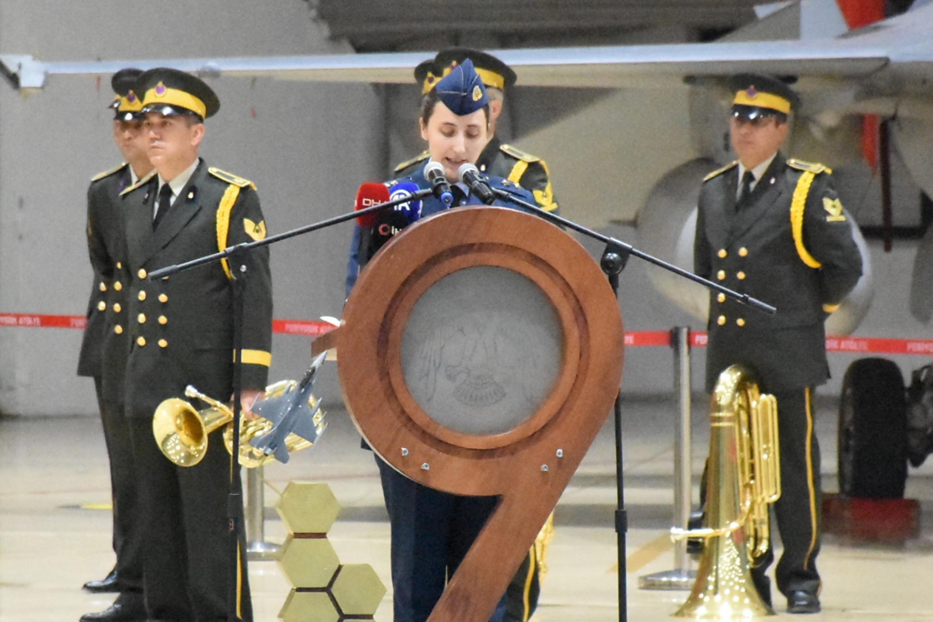 Tuğgeneral Al'ın ardından, dönemin tek kadın F-16 kadın pilotu olan ve dönemi birincilikle bitiren Üsteğmen Geyik, F-16 savaş pilotu olan dönem arkadaşları adına konuşma yaptı. Pilot Üsteğmen Geyik, yıllardır F-16 pilotu olmanın heyecanını yaşadıkları eşsiz bir günde olduklarını söyledi. Üsteğmen Geyik, "F-16 harbe hazırlık eğitimlerinin başarı ile tamamlayarak kanatlarımıza kavuştuğumuz bugünde mezuniyet törenimize teşrifinizle bizleri onurlandıran zatı aliniz ve komutanlarımıza mezun arkadaşlarımız adına saygı ve şükranlarımızı arz ediyoruz. Komutanım, Ulu Önder Gazi Mustafa Kemal Atatürk'ün 'İstikbal Göklerdedir. Göklerini koruyamayan uluslar, yarınlarından asla emin olamazlar' sözü ile geldiğimiz kutsal eğitim yuvasından mezun olduğumuz bugün yüksek düzeyde azim ve fedakarlık isteyen F-16 harbe hazırlık eğitimini başarı ile tamamlamanın haklı gururu içindeyiz. Bizler, icra edeceğimiz her görev için; emir ve direktiflere bağlı uçuş disiplini ve askerlik anlayışı yüksek, doğruluğu kanıtlanmış taktik ve teknik bilgilere bağlı, verilen her türlü görevi yapmaya hazır olacak şekilde, uçuş aşkı ile yetiştirildik. Bundan sonraki kıta hayatımızda da bu prensipler ışığında hareket edecek ve bizlere kendi canımızla birlikte emanet edilen hava kuvvetlerinin gözbebeği F-16 uçaklarını, en etkin ve emniyetli bir şekilde uçuracağız. Milletimiz bilmelidir ki; aziz vatanın müdafaası için yemin etmiş olan bizler, kanımızın son damlasına kadar, sadece devletimize ve milletimize itaat edecek, bize duyduğu güven ve itimada layık olabilmek için, heyecanla çalışarak, hiçbir düşman unsurun, kutsal vatan toprağına girmesine asla müsaade etmeyeceğiz. Yüksek düzeyde askeri ve mesleki disiplini, üstün görev anlayışı, modern bilgi ve beceriyle, Atatürk ilke ve inkılaplarının koruyucusu ve takipçisi olarak yetişmiş biz Türk pilotlarının amacı; hiç durmadan ilerleyen havacılık yarışında, kendi uçağımızı uçurabilmek, aziz vatanımıza yönelebilecek her türlü tehdide karşı göğsümüzü siper etmek ve semalarımızın yılmaz bekçiliğini yapmaktır" diye konuştu.
