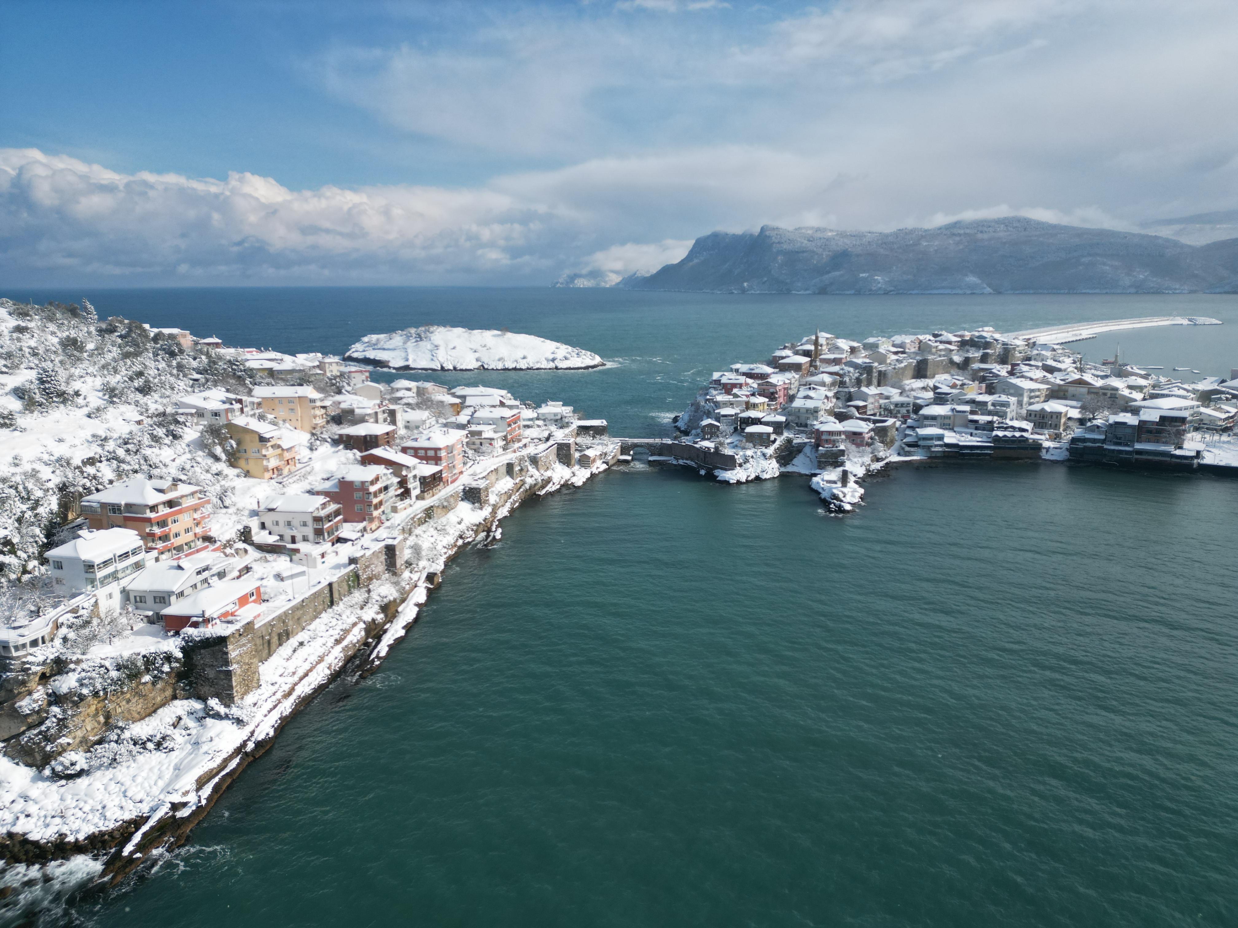 Ayhan ACAR/AMASRA (Bartın), (DHA)- BARTIN'ın tarihi ve turistik ilçesi Amasra, 3 gün devam eden kar yağışıyla beyaza büründü. İlçedeki kar kalınlığı 50 santime ulaşırken, oluşan seyirlik manzara dronla havadan görüntülendi.