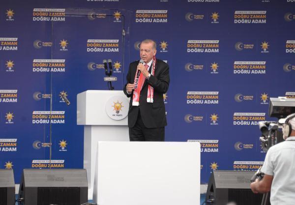 Doğu ve Güneydoğu Anadolu illerinde huzur ve güvenin hakim olduğunu ifade eden Cumhurbaşkanı Erdoğan, “TRT Kürdi’den Kürtçe yayınların özgürce yapılabilmesine, seçmeli Kürtçe derslerine, üniversitelerde Kürt dili bölümlerinin açılmasına kadar, bizden önce konuşulması dahi mümkün olmayan nice adımı cesaretle biz attık biz. Sadece hak ve hürriyetler konusunda değil, aynı zamanda ticarette, sağlıkta, eğitimde, istihdamda her alanda şehirlerimizi çok farklı noktalara taşırken karşımızda hep Bay Bay Kemal ve CHP zihniyetini bulduk. Bizi engellemek için her türlü yolu denediler, her yol başvurdular ama biz onlara rağmen Batman ile birlikte adaleti, refahı ve güvenliği tesis ettik. Batmanlı kardeşlerim ekmeğini kazanmak için gurbete gitmek zorunda kalmıyor. Batmanlı sanayiciler terör tehdidi olmadan kendi ana ocaklarına yatırım yapabiliyor, çiftçilerimiz toprağını ekiyor, mahsulünü topluyor. Uzun yıllar teröristlerin cirit attığı bölgelerde artık kınalı kuzuların sesleri, çobanlarımızın yüreğinden kopan dengbejlere karışıyor. Nereden nereye. Tarihi ve doğal güzelliklerini görmek için ülkemizle birlikte, dünyanın dört bir yanından Batman’a gelebiliyor. Aynı durum diğer tüm illerimiz için de geçerlidir. Diyarbakır’dan Şırnak’a, Mardin’den Hakkari’ye kadar huzur ve güven ortamı hakim olmuştur. Yıllardır terörle, yokluk ve yoksullukla anılan bölgelerimize hakiki baharı hamdolsun biz getirdik. Bu kazanımlardan artık geri dönüş olmayacaktır. Her kim terör örgütlerinin tehdidi altındaki eski Türkiye’yi horlatmaya çalışırsa bizi bulacaktır. Her kim gariban Kürt kardeşlerimin eline silah verip insanımız, polisimize askerimize kurşun sıktırmaya kalkarsa karşısında bizi bulacaktır. Her kim emperyalist güçler adına milletimizin huzuruna kastederse karşısında bizi bulacaktır” diye konuştu.