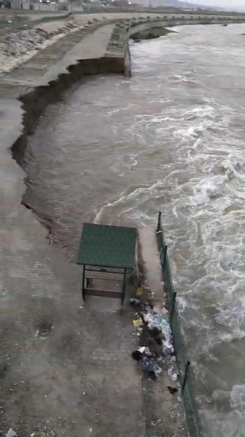 Arif ARSLAN/BATMAN,(DHA)- BATMAN’da etkili olan yağışların ardından su seviyesinin yükseldiği Batman Çayı’nda taşkın koruma duvarı yıkıldı. Duvarın çökmesiyle birlikte yaya parkur yolunun bir bölümünde de hasar oluştu.