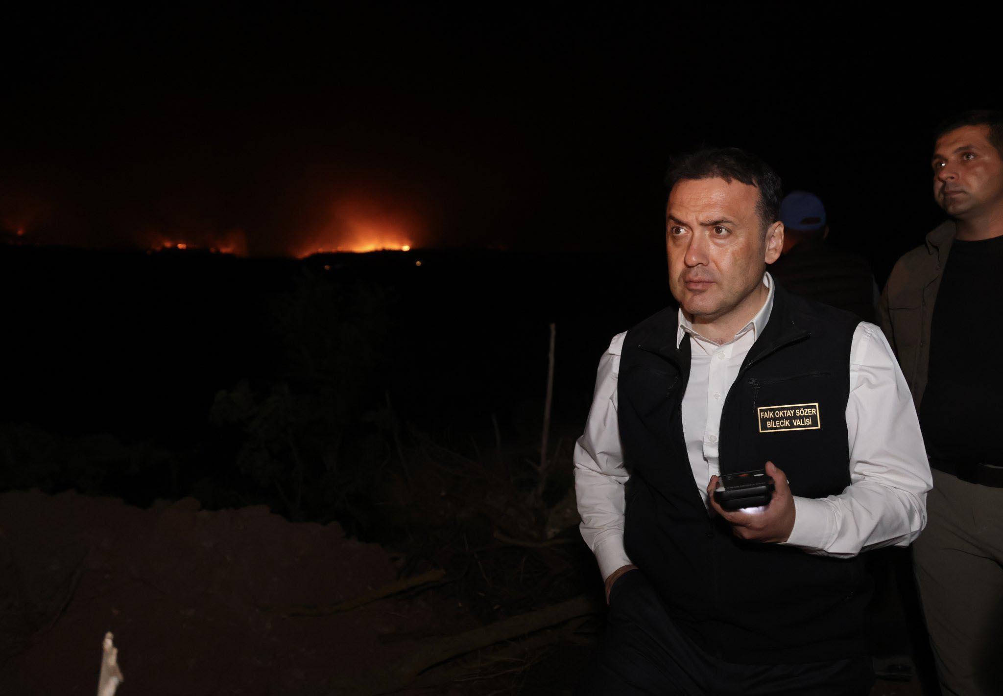 Bilecik Valisi Faik Oktay Sözer, orman yangınının yayılma tehlikesi nedeniyle boşaltılan 4 köyü ziyaret etti. Yangın söndürme çalışmalarıyla ilgili bilgi alan Vali Sözer, orman yangınının enerjisini düşürdüklerini söyledi. Ekiplerin sabaha kadar çalışmalarını sürdüreceğini ifade eden Vali Sözer, “Çok ciddi bir ekibimiz var. Ekibimiz sabaha kadar çalışacak. Gördüğünüz gibi burası Kazancı köyümüz, iç kesimlerinde yangın ihtimaline karşı burada önleme çalışmaları devam ediyor. Aynı şekilde Borcak köyünde de tedbirlerimizi aldık. Umut ediyoruz ki rüzgarımız diner, dindiği zaman bu ekiplerle beraber çok kısa sürede enerjisini düşürüp, söndürme çalışmalarımızı tamamlayacağımızı düşünüyoruz. Şu an ilk etabıyla enerjisini düşürdük ama kontrol altında diyemeyiz. Yalnız tedbirlerimiz var, çalışmalarımız sabaha kadar devam edecek. Şükürler olsun 4 köyümüzü boşalttık ama herhangi bir can kaybımız yok. Hayvansal anlamda da yok. Bu da bizi mutlu ediyor” dedi.
