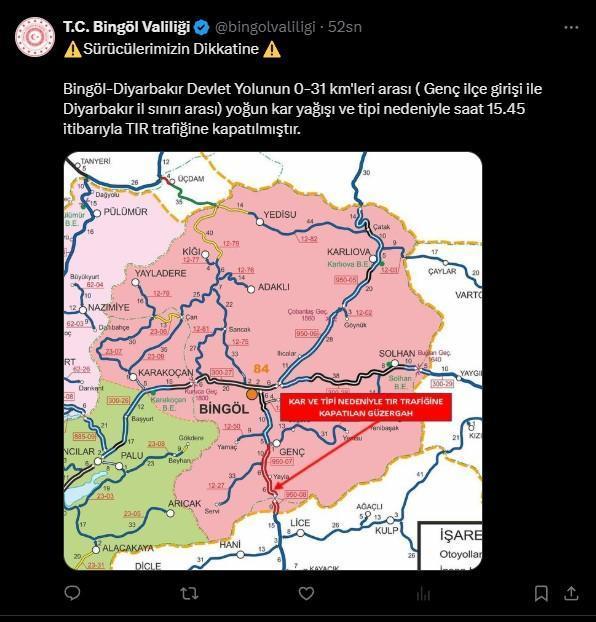 Bingöl Valiliği, Bingöl-Diyarbakır kara yolunun bir bölümünün TIR trafiğine kapatıldığını duyurdu. Valilik açıklamasında, “Bingöl-Diyarbakır Devlet Yolunun 0-31 kilometreleri arası (Genç ilçe girişi ile Diyarbakır il sınırı arası) yoğun kar yağışı ve tipi nedeniyle saat 15.45 itibarıyla TIR trafiğine kapatılmıştır” denildi.