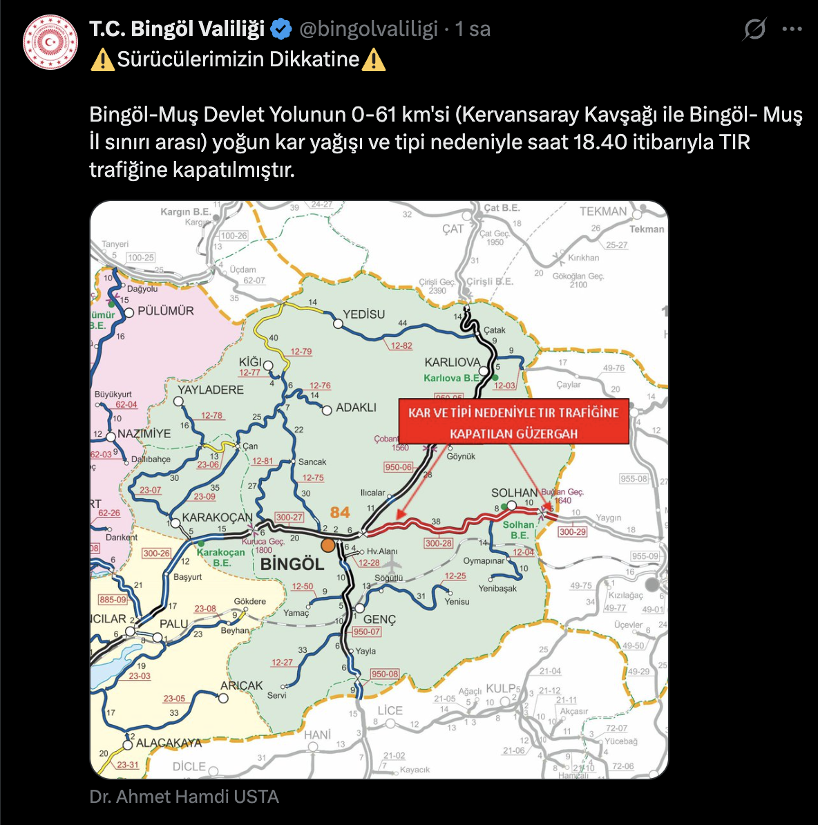 Bingöl Valiliği'nin sanal medya hesabından yapılan açıklamada, Bingöl-Diyarbakır ve Bingöl-Muş kara yollarının yoğun kar yağışı nedeniyle TIR trafiğine kapatıldığı belirtildi. Açıklamada, “Bingöl-Diyarbakır Devlet Yolunun 0-31 kilometreleri arası (Genç ilçe girişi ile Diyarbakır il sınırı arası) yoğun kar yağışı ve tipi nedeniyle saat 18.40 itibarıyla TIR trafiğine kapatılmıştır. Bingöl-Muş Devlet Yolu'nun 0-61 kilometreleri arası (Kervansaray Kavşağı ile Bingöl- Muş İl sınırı arası) yoğun kar yağışı ve tipi nedeniyle saat 18.40 itibarıyla TIR trafiğine kapatılmıştır” denildi.