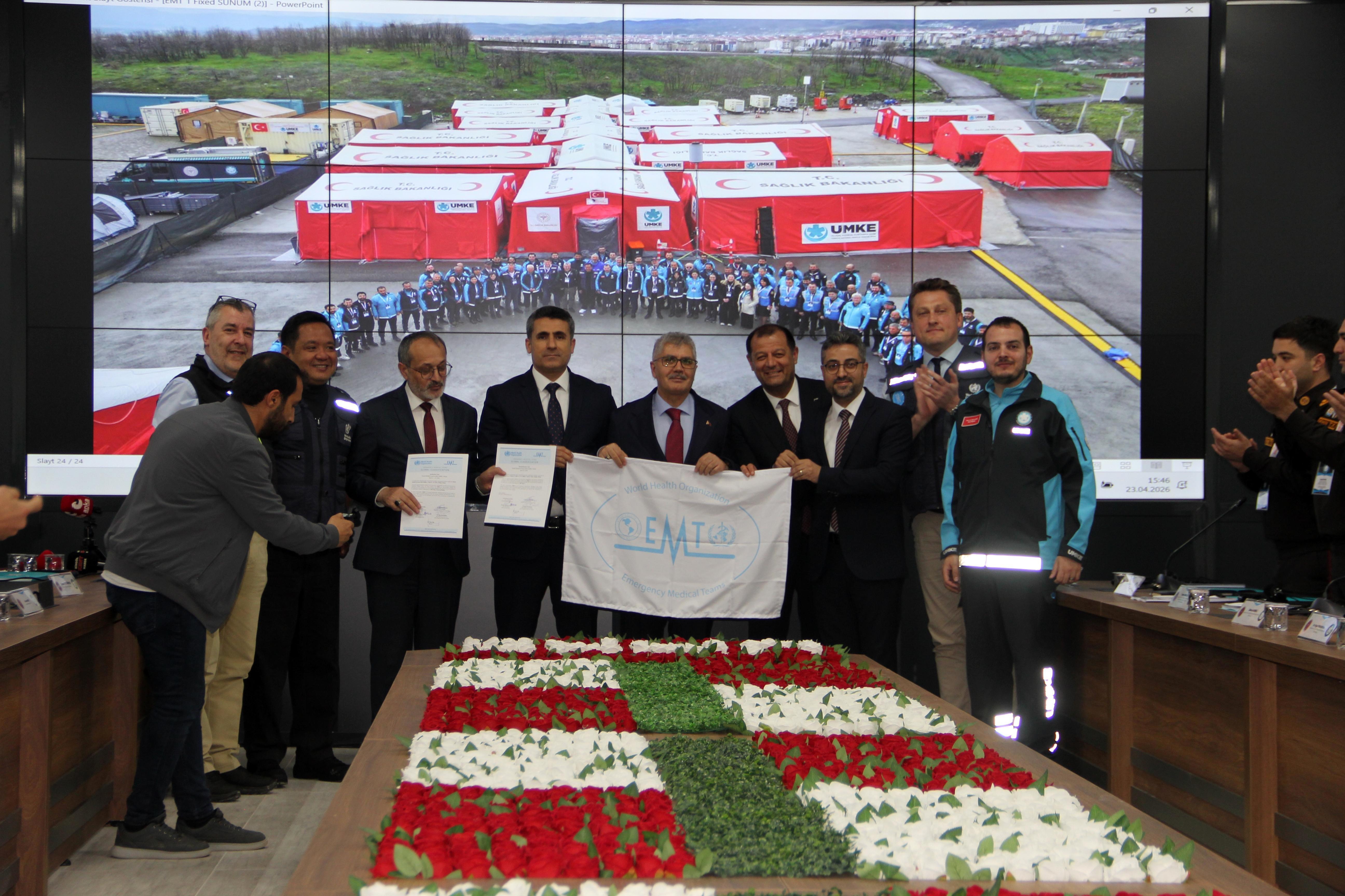 Aziz ÖNAL/BİNGÖL, (DHA)- BİNGÖL’de kurulan UMKE Lojistik ve Operasyon Merkezi, Acil Sağlık Müdahale Ekipleri (EMT) kapsamında Dünya Sağlık Örgütü (DSÖ) tarafından uluslararası doğrulama sürecini tamamladı. Merkezde, bayrak teslim töreni düzenlendi.