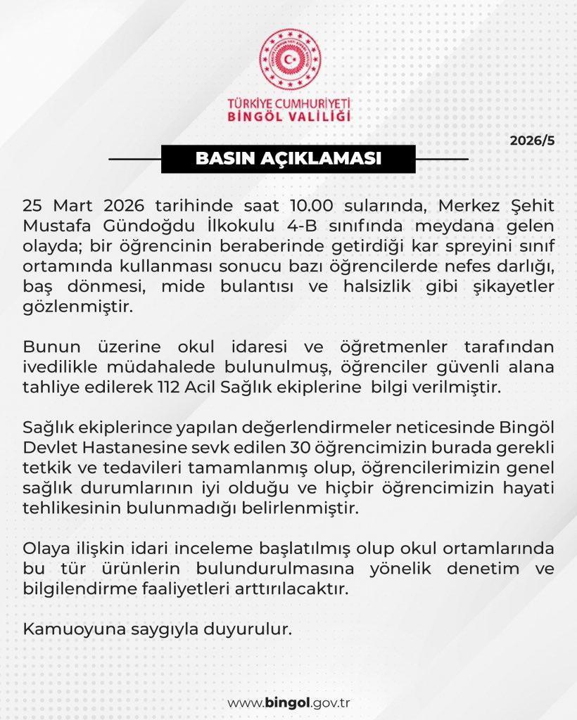 Bingöl’de bir öğrencinin sınıfa getirdiği kar spreyini kullanması sonucu açığa çıkan gazdan etkilenen öğrenci sayısı 30’a yükseldi. Bingöl Valiliği’nden yapılan açıklamada, öğrencilerin sağlık durumlarının iyi olduğu belirtilerek, “25 Mart 2026 tarihinde saat 10.00 sularında, Merkez Şehit Mustafa Gündoğdu İlkokulu 4-B sınıfında meydana gelen olayda; bir öğrencinin beraberinde getirdiği kar spreyini sınıf ortamında kullanması sonucu bazı öğrencilerde nefes darlığı, baş dönmesi, mide bulantısı ve halsizlik gibi şikayetler gözlenmiştir. Bunun üzerine okul idaresi ve öğretmenler tarafından ivedilikle müdahalede bulunulmuş, öğrenciler güvenli alana tahliye edilerek 112 Acil Sağlık ekiplerine bilgi verilmiştir. Sağlık ekiplerince yapılan değerlendirmeler neticesinde Bingöl Devlet Hastanesine sevk edilen 30 öğrencimizin burada gerekli tetkik ve tedavileri tamamlanmış olup, öğrencilerimizin genel sağlık durumlarının iyi olduğu ve hiçbir öğrencimizin hayati tehlikesinin bulunmadığı belirlenmiştir. Olaya ilişkin idari inceleme başlatılmış olup okul ortamlarında bu tür ürünlerin bulundurulmasına yönelik denetim ve bilgilendirme faaliyetleri arttırılacaktır. Kamuoyuna saygıyla duyurulur” denildi. (DHA)