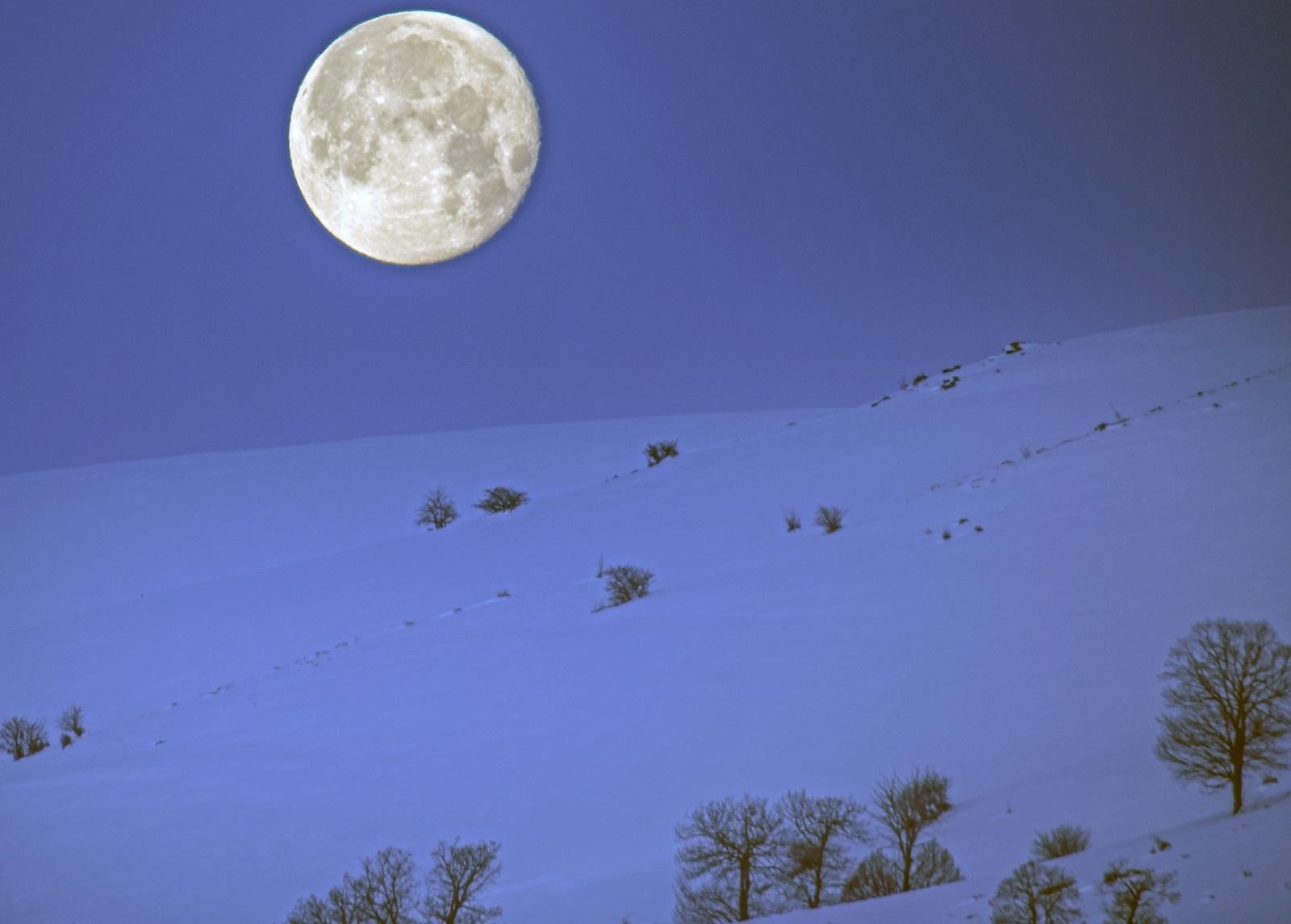 Karlı dağlar ile dolunay aynı karede güzel görüntüler oluşturdu