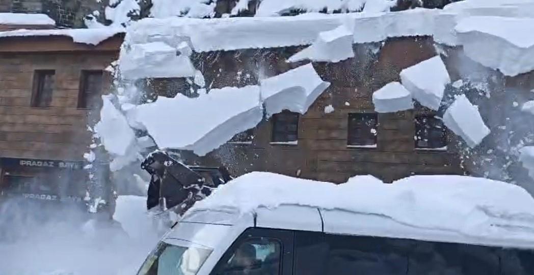 Özcan ÇİRİŞ/BİTLİS, (DHA)- BİTLİS’te yol temizleme çalışmaları sırasında iş makinesinin üzerine bir iş yerinin çatısından tonlarca ağırlığında kar kütlesi düştü.