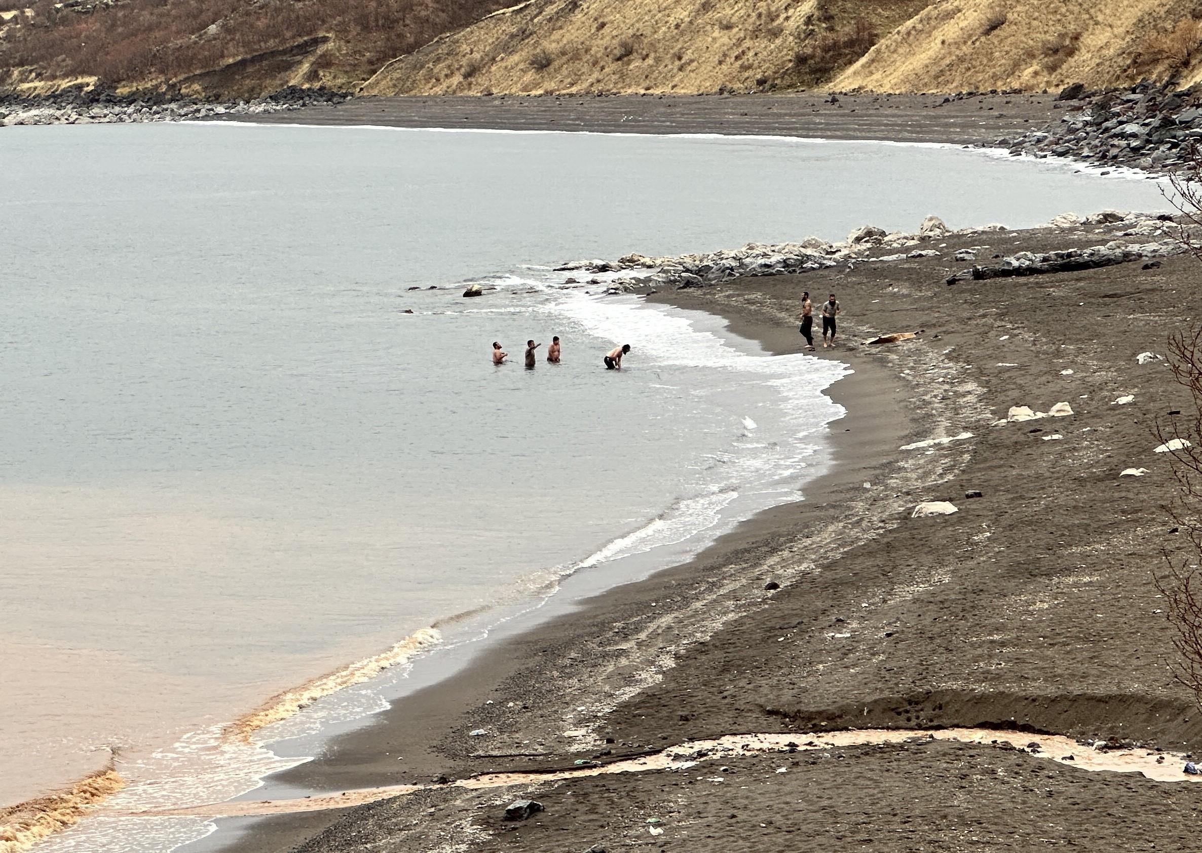 Özcan ÇİRİŞ/BİTLİS, (DHA)- BİTLİS'te hafta sonu etkili olan yağmur, yüksek kesimlerde yerini kar yağışına bıraktı. Şehir merkezine yakın olan, Van Gölü kıyısına gelen bazı kişiler ise soğuk havaya aldırmadan serin sulara girip yüzdü.