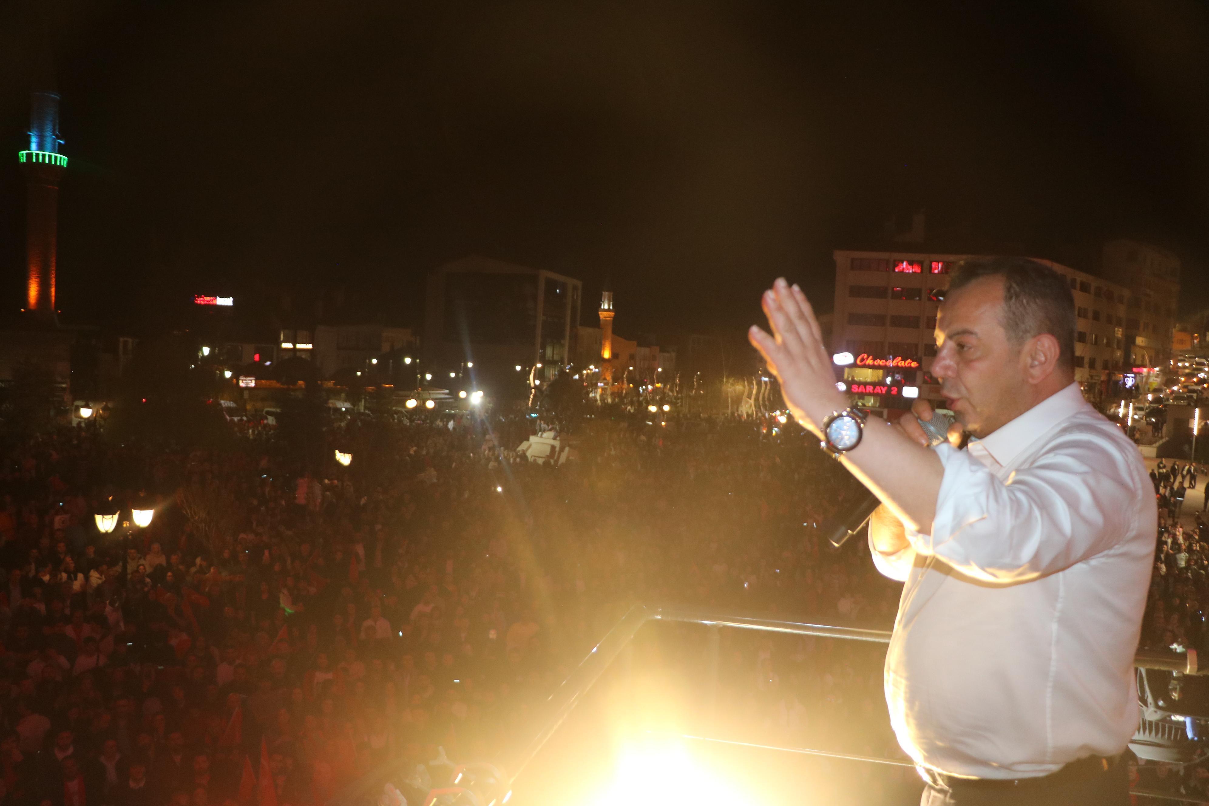 Mutlu YUCA/ BOLU, (DHA)- BOLU Belediye Başkanı CHP'li Tanju Özcan’ın resmi olmayan sonuçlara göre seçimi ikinci kez kazanması kentte coşkuyla kutlanırken, belediye binasının balkonundan vatandaşlara seslenen Özcan, vatandaşların 'Cumhurbaşkanı Tanju Özcan' şeklindeki sloganlarına, "Nasipse ona da sıra gelecek" dedi. Resmi olmayan sonuçlara göre; Bolu’da 4 ilçeyi AK Parti kazanırken, 4 ilçeyi ise CHP kazandı.