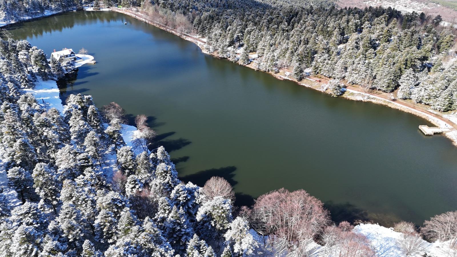 Zübeyde ÖZMEN/BOLU,(DHA)-BOLU'da Gölcük Tabiat Parkı, kar yağışı sonrası beyaz örtüyle kaplandı. Eşsiz manzara dron ile görüntülendi.
