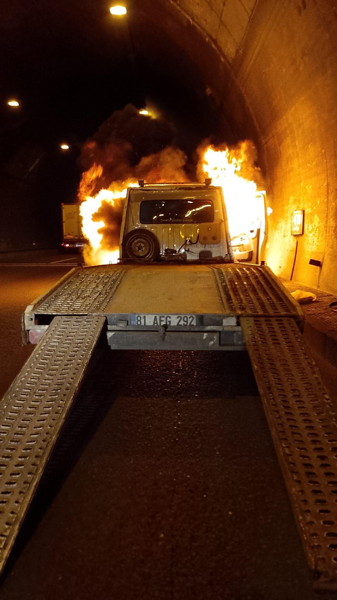 Yangın, akşam saatlerinde Anadolu Otoyolunun Bolu Dağı Tüneli içerisinde meydana geldi. 81 AFG 292 plakalı oto kurtarıcı, üzerinde araç taşıdığı sırada motor kısmından tutuştu. Oto kurtarıcıdan çıkan dumanların Tünel Kontrol Merkezindeki kameralardan tespit edilmesiyle olay yerine itfaiye ekibi sevk edildi. Ekibin müdahalesinin ardından alev alan oto kurtarıcı kısa sürede söndürülürken araçta büyük hasar meydana geldi.