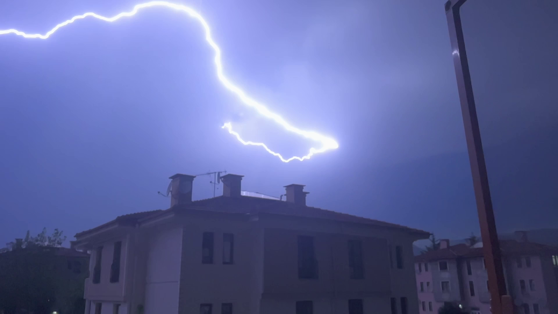 Bolu’da gün boyu güneşli olan hava, akşam saatlerinde yerini sağanak yağışa bıraktı. Gök gürültülü yağmurla birlikte arka arkaya çakan şimşekler, gökyüzünü aydınlattı. Düşen yıldırım da kentte korkuya neden oldu. Yıldırım düşme anları cep telefonu kameralarına yansıdı. (DHA)