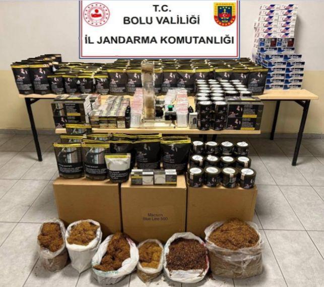 Bolu İl Jandarma Komutanlığı Kaçakçılık ve Organize Suçlarla Mücadele Şube Müdürlüğü ekipleri tarafından kaçak tütün ürünleri sattığı belirlenen şüphelinin evinde ve işyerinde arama yapıldı. Ekipler tarafından yapılan aramada 1 adet elektrikli makaron sarma makinesi, 28 kilo 300 gram tütün, 20 bin adet boş makaron, 6 bin 120 adet dolu makaron, 6 adet elektronik sigara likiti, 25 kilo 900 gram nargile tütünü ele geçirildi. Olayla ilgili 1 şüpheli hakkında yasal işlem başlatıldı. (DHA)