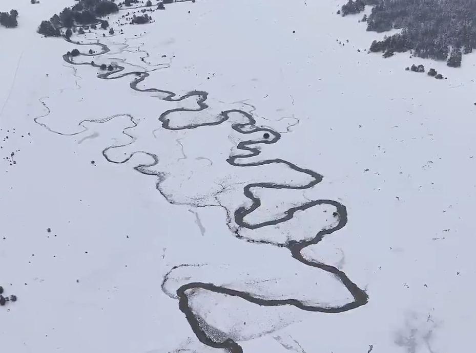 Karla kaplı bölgede menderesler dron ile görüntülendi
