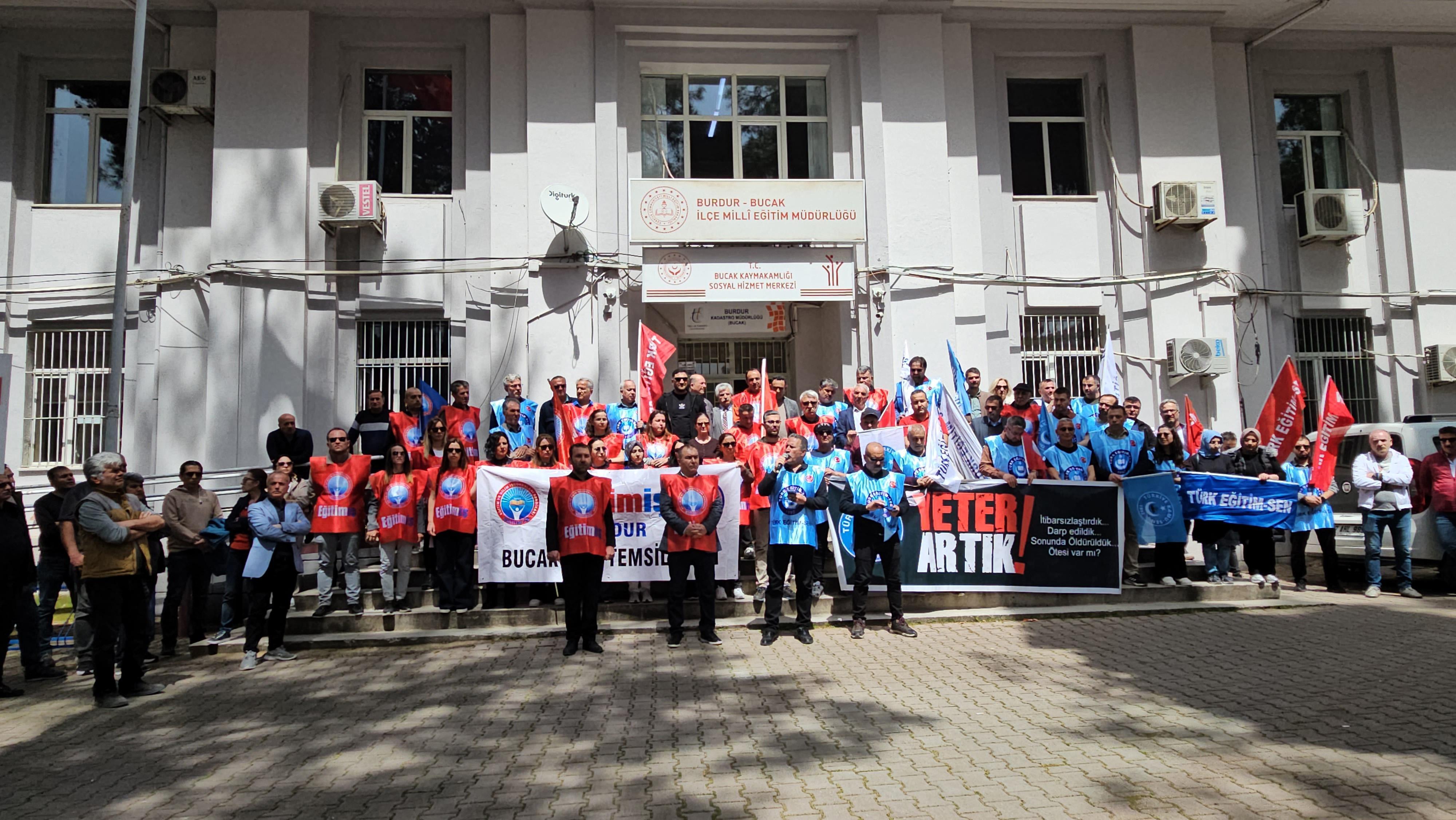 Halim AKCA/BUCAK, (DHA) - BURDUR'un Bucak ilçesinde Türk Eğitim-Sen ve Eğitim-İş Sendikası, Şanlıurfa ve Kahramanmaraş'ta okullarda meydana gelen ve can kayıplarıyla sonuçlanan saldırıları protesto amacıyla ortak basın açıklaması gerçekleştirdi.