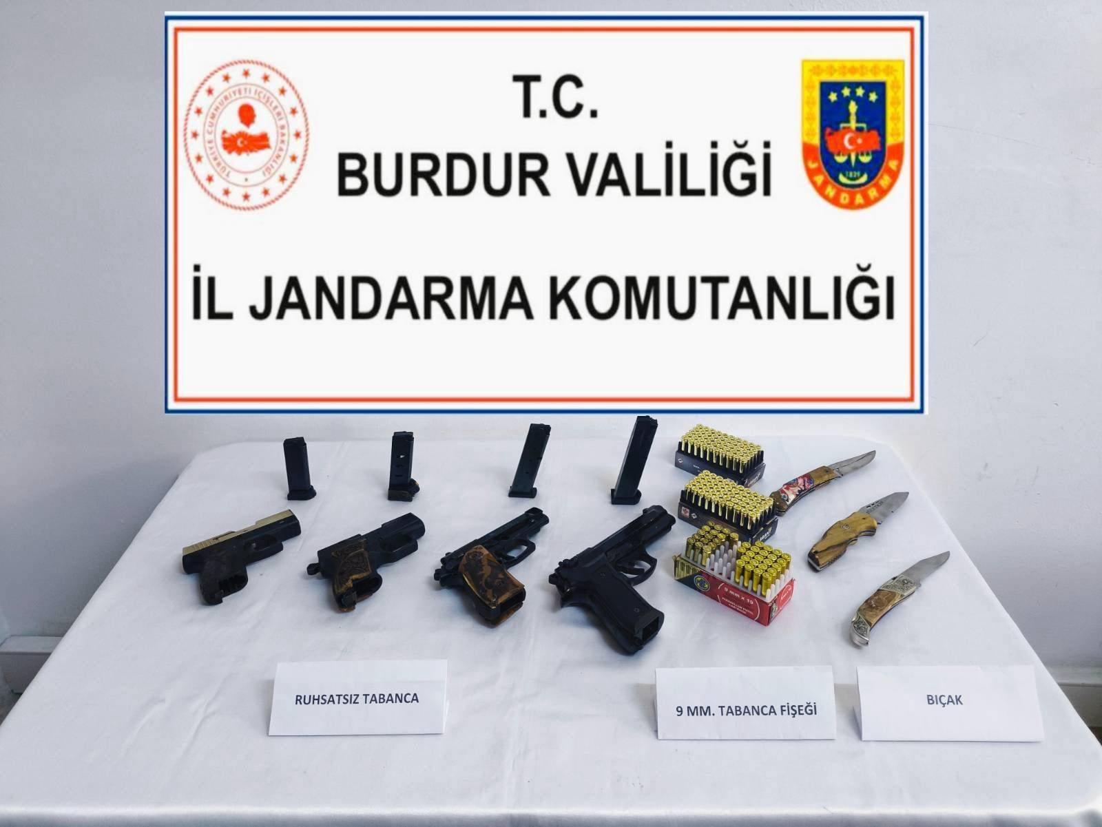 Burdur İl Jandarma Komutanlığı ekipleri tarafından 1-30 Nisan tarihleri arasında kaçakçılık ve narkotik suçlarla mücadeleye yönelik yapılan 31 operasyonda gözaltına alınan 46 kişiden 1'i adli kontrollü olmak üzere 30'u serbest bırakıldı. 16 şüpheli ise tutuklanarak cezaevine teslim edildi. Operasyonlarda 5 tabanca, 3 av tüfeği, 4 tabanca şarjörü, 138 tabanca mühimmatı, 2 av tüfeği mühimmatı, 3 bıçak, 40 litre el yapımı şarap, 130 litre el yapımı bira, 16 litre el yapımı viski, 2 litre el yapımı rakı, şişe kapatma aparatı, 750 bira kapağı, 500 boş şişe, 18 alkol aroması, 12 alkol damıtma kiti, 6 kilo tütün, 1300 makaron, 31 sigara kağıdı, 8 elle makaron doldurma makinesi, 24 kulaklık, 16 akıllı saat, 14 dijital materyal, 5 telefon bataryası, 2 dedektör, 6 muhtelif kazı malzemesi, 1,33 gram bonzai, 5 gram metamfetamin, 2 gram kubar esrar, 3 gram skunk ve 62 kullanma aparatı ele geçirildi. (DHA)