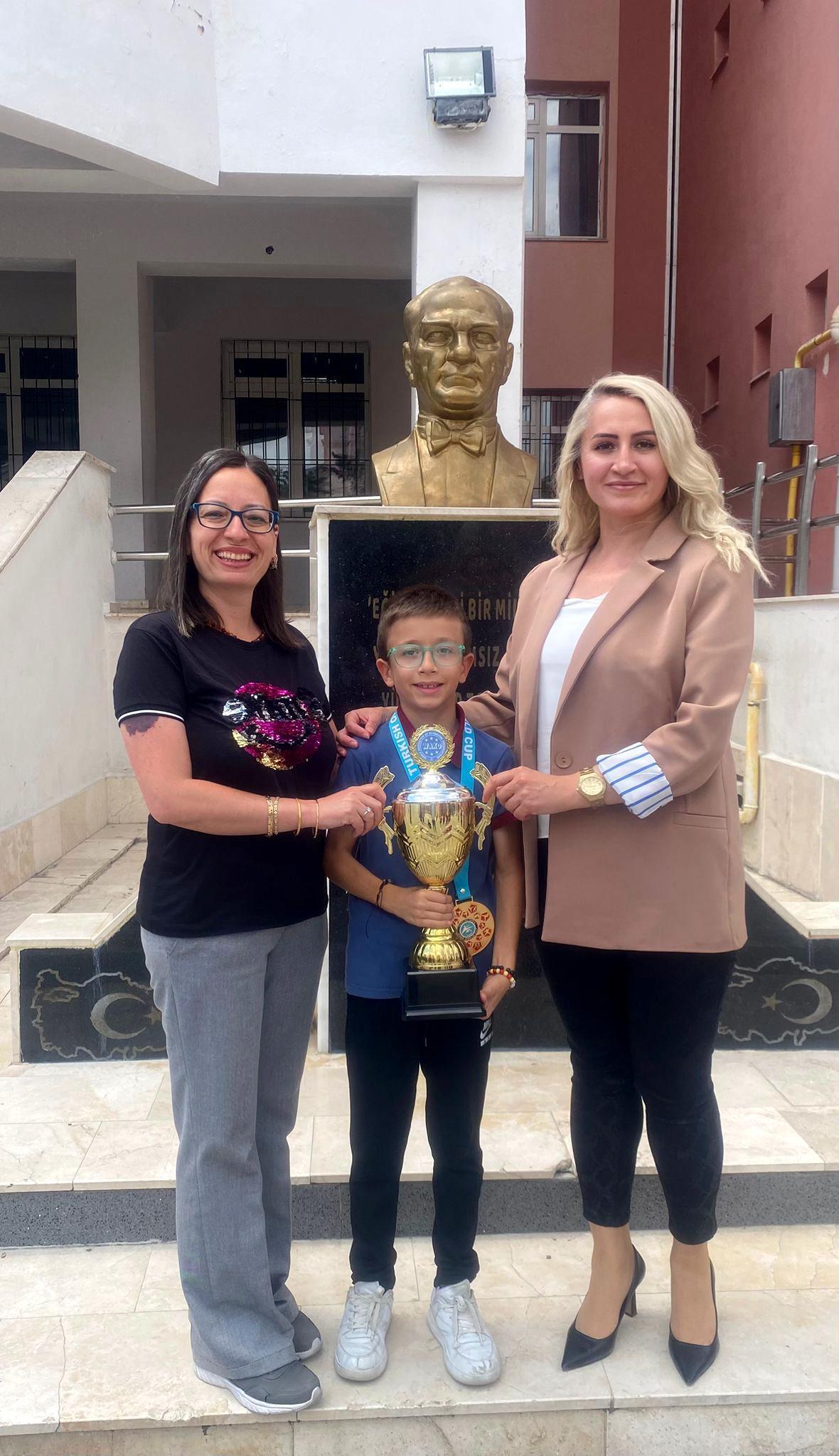 Eroğlu, kupa ve madalyası ile Okul Müdürü Hanım Aktaş'ı ziyaret etti. Şampiyon öğrencisini ödüllendiren Aktaş, kazandığı şampiyonluktan dolayı tebrik ederek başarılarının devamını diledi. (DHA)