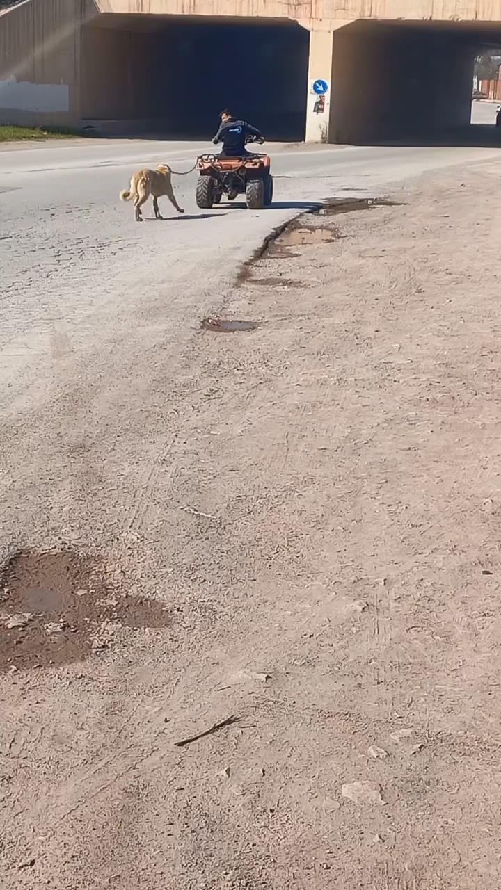 Bursa'da bir kişi, kangal cinsi köpeğini ATV motoruna bağladı. Daha sonra motorunu çalıştıran kişi, hareket ederek köpeği sürükledi. O anlar bir vatandaş tarafından cep telefonu kamerasıyla kaydedildi. (DHA)