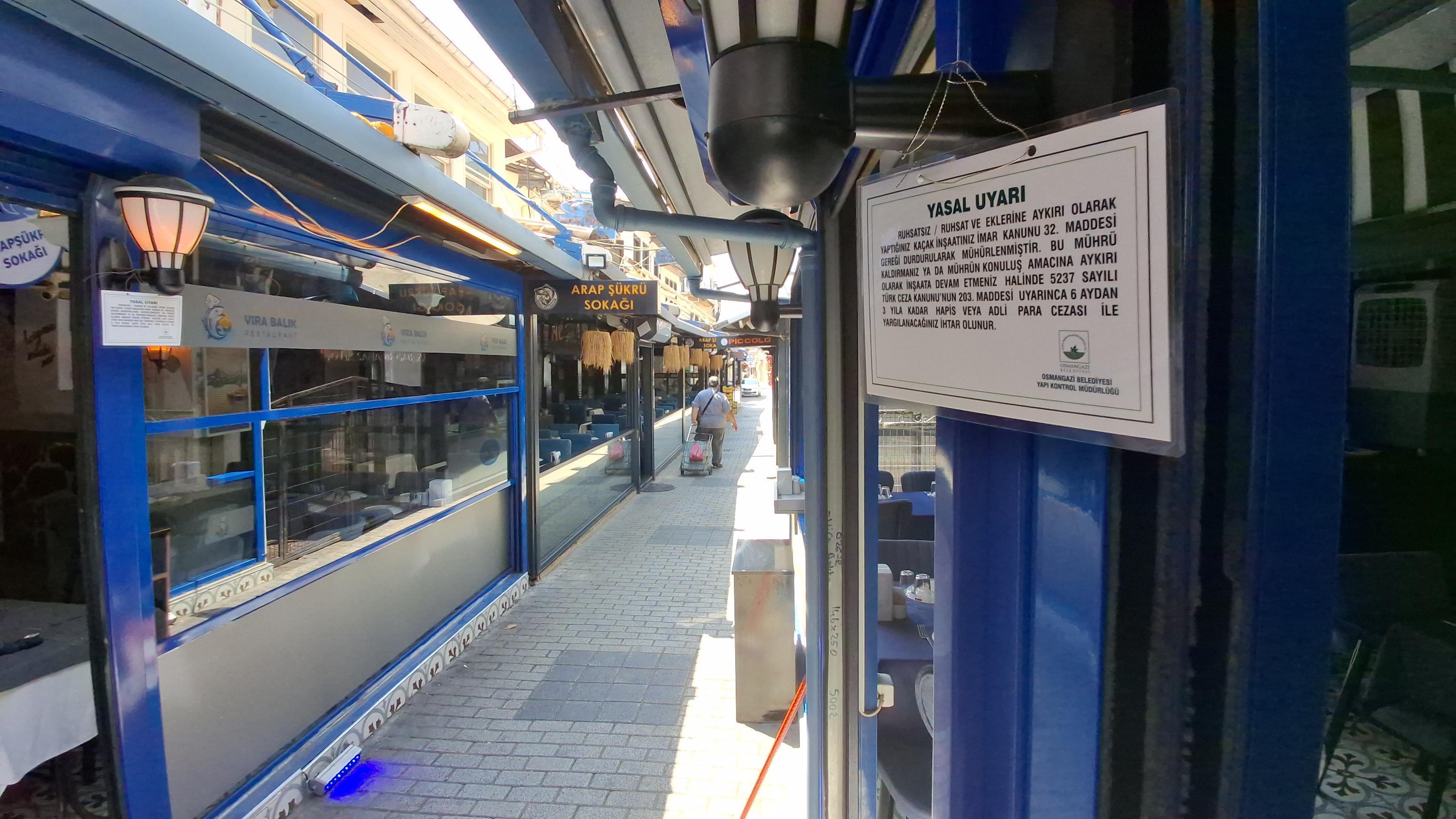 Denizhan TECİK-Mehmet Can YEŞİLBAŞ/BURSA, (DHA)- BURSA'nın, tarihi ve eğlence hayatıyla özdeşleşen Arap Şükrü Sokağı’nda, geçmiş dönem belediye başkanı tarafından yaptırılan cam bölme ve tenteler nedeniyle, 11 işletme Osmangazi Belediyesi tarafından mühürlendi.