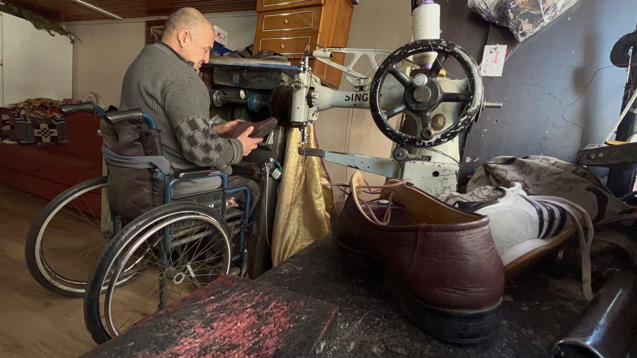 Engeli nedeniyle giyemediği ayakkabıları 30 yıldır tamir edip geçimini sağlıyor