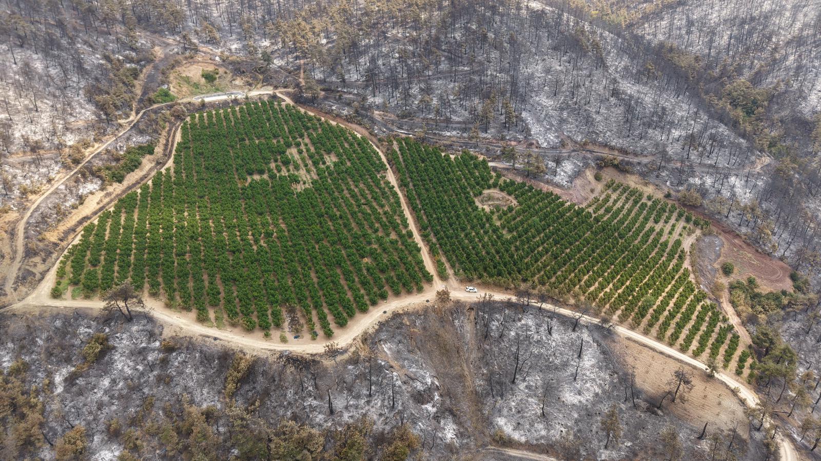 Bursa'nın Kestel-Gürsu ilçelerinde yanan ormandan geriye küller kalırken, köylülerin geçim kaynağı olan tarım alanlarının arasında yemyeşil kalan 25 dönümlük nektarin bahçesi dronla görüntülendi. Gürsu ilçesine bağlı Karahıdır Mahallesi’ndeki bahçeye alevlerin sıçramadığı görüldü.