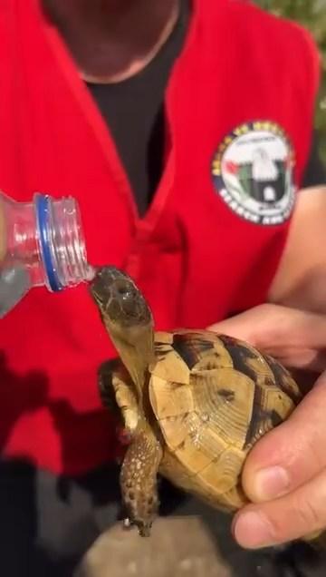 Bursa'nın Orhaneli ve Harmancık ilçelerinde 4 gündür devam eden yangınlarda söndürme çalışmalarına katılan ekipler, bölgedeki hayvanları kurtarmak için de canla başla mücadele veriyor. Harmancık ilçesinde görev alan MUŞDER Arama Kurtarma ekibinden bir gönüllü, alevlerin arasından kurtardığı kaplumbağaya pet şişe ile su verdi. Kaplumbağanın su içtiği anlar cep telefonuyla görüntülenirken, MUŞDER gönüllüsü vatandaşları uyararak, "Bu da bir can. Bu da bir evlat. Sigara atarken, şişe atarken dikkat edin Allah rızası için. Binlercesi böyle hayvanların orada yanıyor. Başka zaman bu hayvana hiçbir şey yapamazsın. Kendi su içiyor" dedi. (DHA)