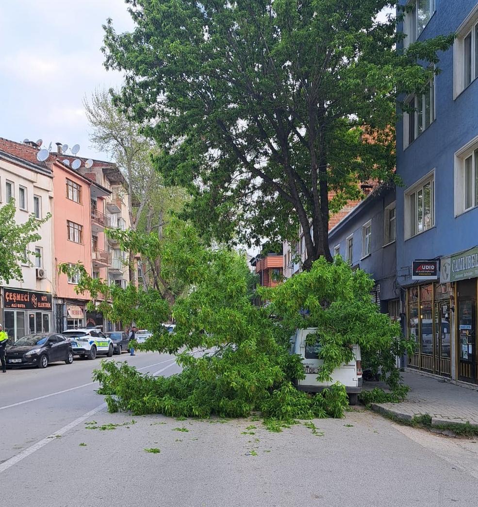 Yavuz YILMAZ/İNEGÖL (Bursa), (DHA)-BURSA’nın İnegöl ilçesinde ağacın kırılan dalı park halindeki hafif ticari aracın üstüne düştü.