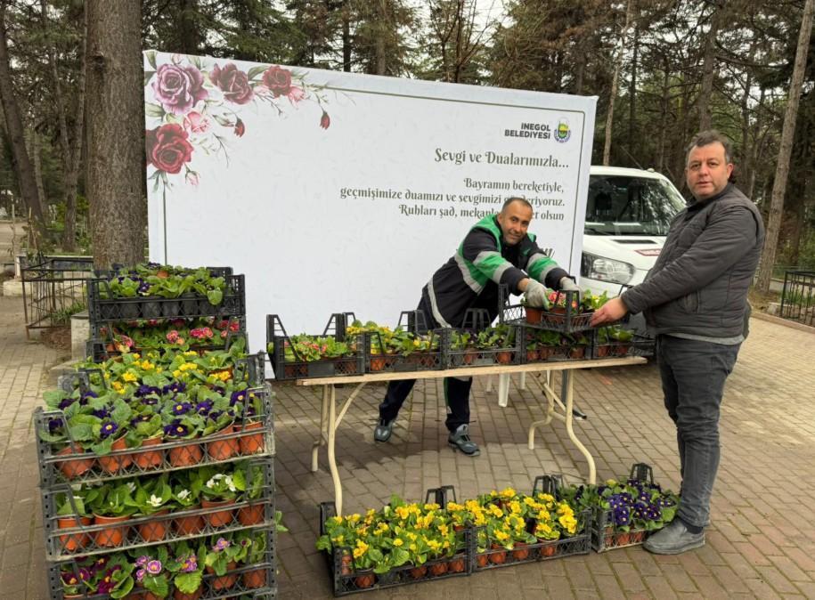 Yavuz YILMAZ/İNEGÖL (Bursa), (DHA)-BURSA’da İnegöl Belediyesi, her bayram arifesinde mezarlık ziyaretine gelen vatandaşlara çiçek dağıtma geleneğini Ramazan Bayramı arifesinde de sürdürdü. Mezarlık ziyaretine gelen vatandaşlara kabirlere ekmeleri için, ücretsiz olarak 9 bin adet çiçek dağıtıldı.