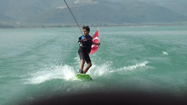 9 yaşındaki Egemen, su kayağı yaparak 30 Ağustos'u kutladı