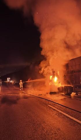 Hüseyin T. (35) 16 BUD 825 plakalı mısır yüklü TIR ile İnegöl’den Bursa yönüne ilerlerken, saat 05.00 sıralarında motor kısmından duman çıktığını fark etti. Bursa-Ankara karayolu Kestel ilçesi Ümitalan Mahallesi mevkisinde aracını yol kenarına park eden sürücü, itfaiyeye haber verdi. İhbar üzerine bölgeye itfaiye ekipleri sevk edildi. Ekiplerin müdahalesiyle söndürülen TIR, kullanılamaz hale geldi. (DHA)